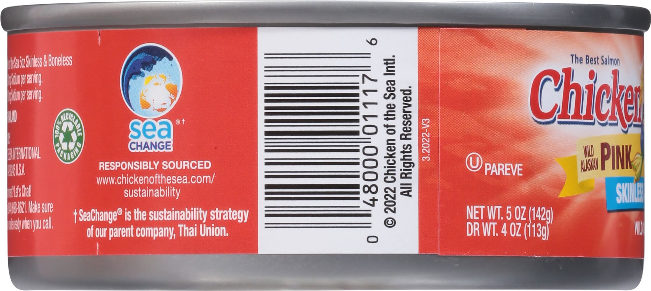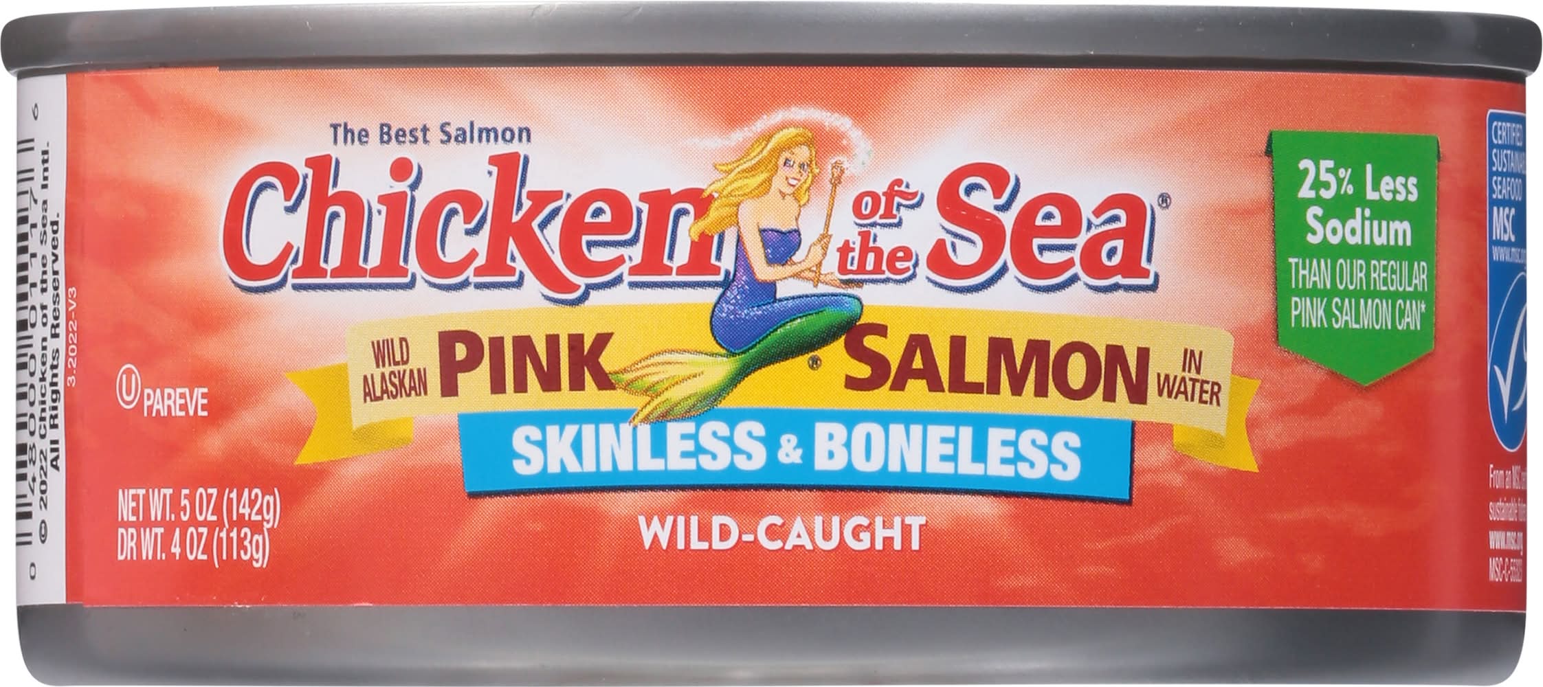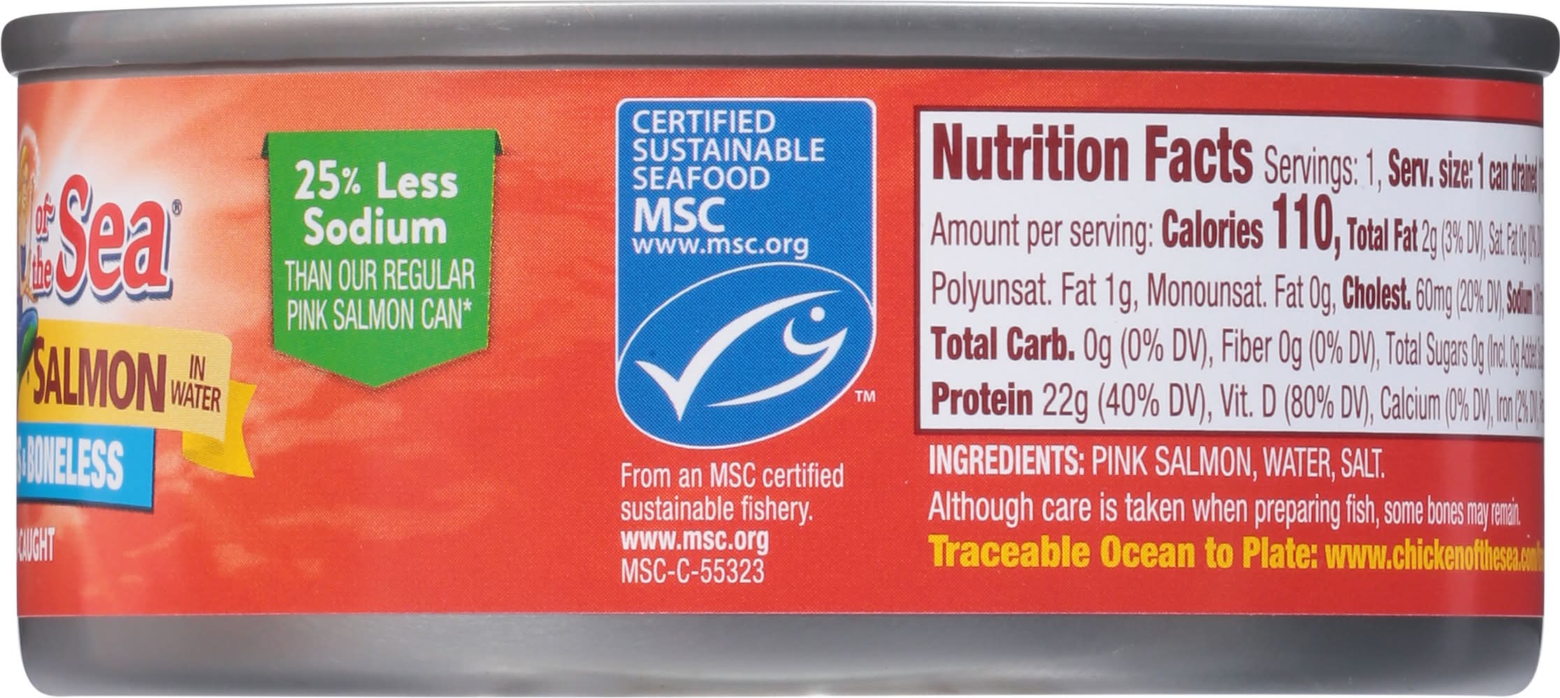 Wild Alaskan pink salmon in water. Dr wt. 4 oz (113 g). 25% less sodium than our regular pink salmon can (Regular Chicken of the Sea 5 oz Skinless & Boneless Pink Salmon: 240 mg Sodium per serving. This product: 180 mg Sodium per serving). The best salmon. www.chickenofthesea.com/trace. Question or Comment? Let's Chat! Call us toll free (844) 698-8621. Make sure to have your can code ready when you call. Traceable Ocean to Plate: www.chickenofthesea.com/trace. MSC: Certified sustainable seafood. www.msc.org. From an MSC certified sustainable fishery. www.msc.org. 100% Recyclable packaging. Sea Change (SeaChange is the sustainability strategy of our parent company, Thai Union): Responsibly sourced. www.chickenofthesea.com/sustainability. Product of Thailand.