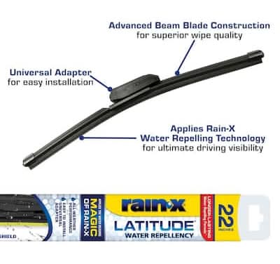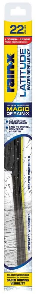 Outsmart the Elements with Rain-X! No other wipers deliver the innovation and technology that is offered by Rain-X Latitude Water Repellency Wiper Blades. These unique blades apply new Rain-X water-repellent technology directly to your windshield, which now lasts longer than ever! The water-repellent transfers from the squeegee to the glass - and the magic of Rain-X is activated! Rain-X Latitude Water Repellency Wiper Blades feature advanced beam technology designed to hug your windshield for maximum contact and superior wipe quality. These 2-in-1 wiper blades both clear and repel the elements to provide enhanced driving visibility. Compared to traditional wiper blades, the difference is amazing! For optimal water repellency activation, run your wiper blades on a clean, wet, or dry windshield for 2 minutes. Once activated, the water-repelling action will last for the life of the blade. Size: 22"