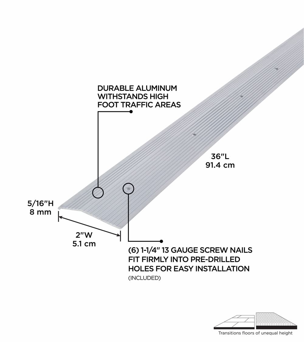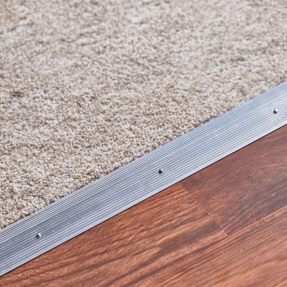 Aluminum Carpet Trim easily covers a seam or gap between two flooring surfaces of unequal height. Carpet Trim prevents carpet edges from fraying, vinyl floor seams from curling and creates a smooth transition between different flooring surfaces. Secure to wood floors with provided Screw Nails. For concrete floors, install with Screw Nails & Wood Pegs (Wood Pegs sold separately). Cancer and Reproductive Harm - www.P65Warnings.ca.gov. • Color: Silver • Size: 2x36 in