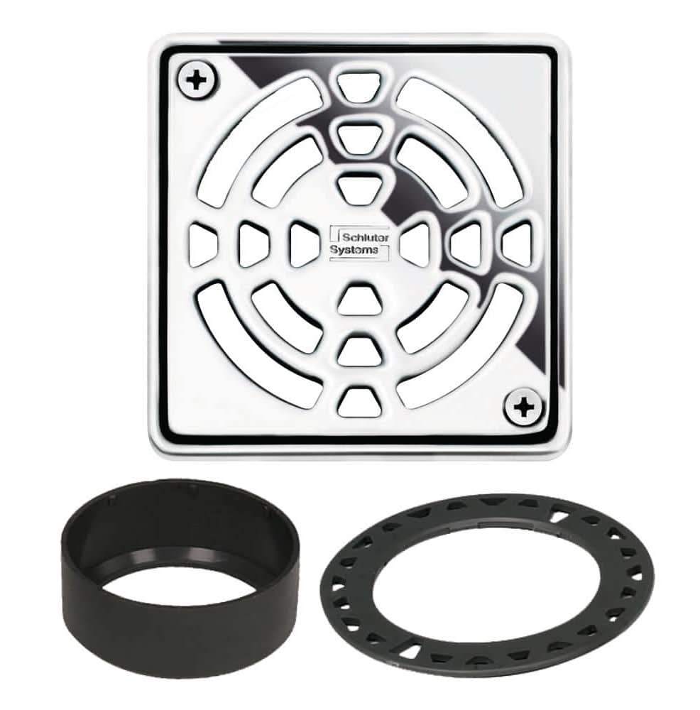 4-In square grate. Chrome finish. Use with Kerdi-Drain flange sold separately. Package includes: 4-in square grate and frame, height adjustment collar and lateral adjustment ring. For residential and commercial applications. Color: Chrome