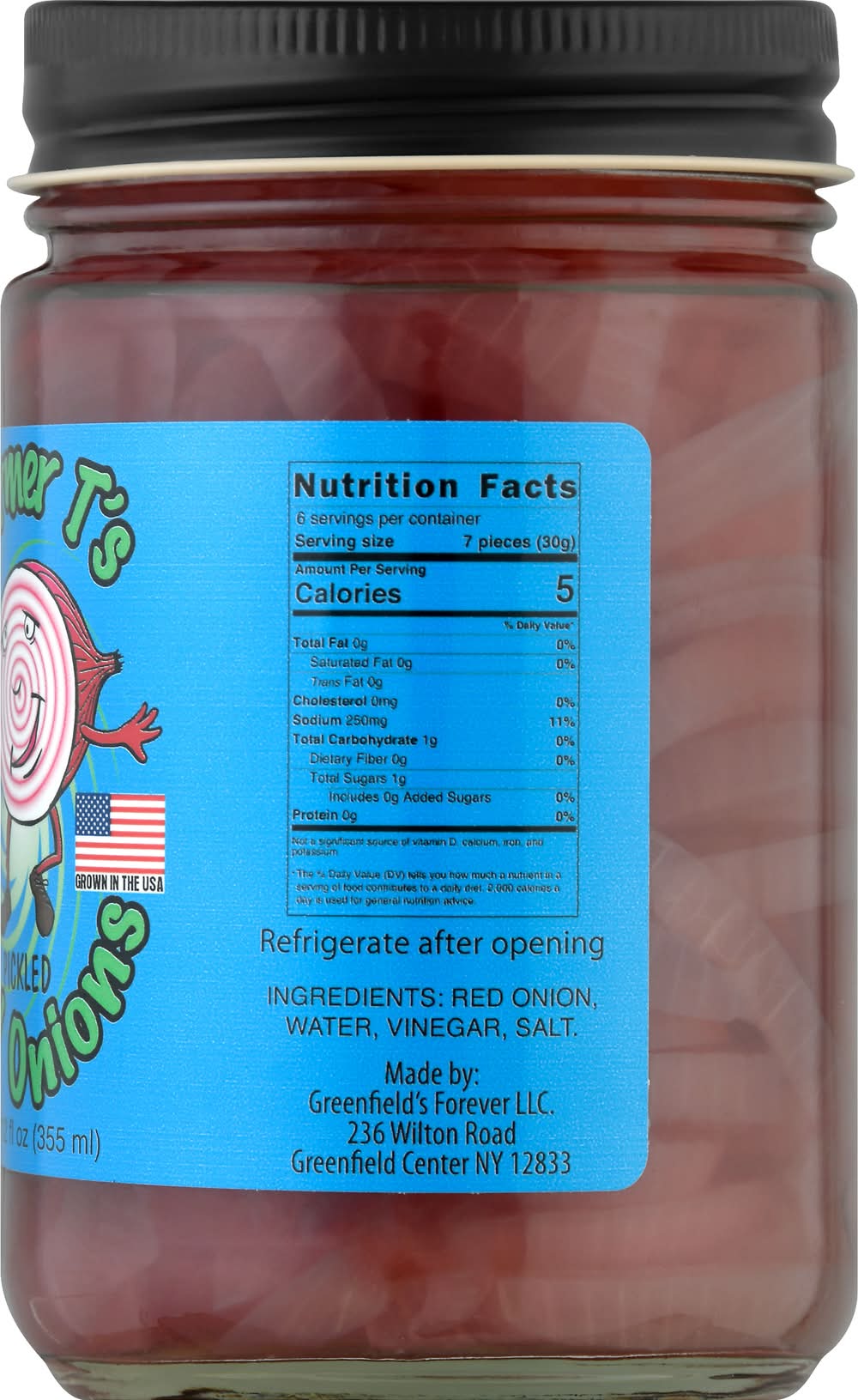 Support our farmers by using onions grown in the USA. Enjoy this delicious product in your favorite recipe salads, antipasto or, our favorite, right out of the jar. Thanks for your support, Farmer T. Grown in the USA. Greenfields Forever,