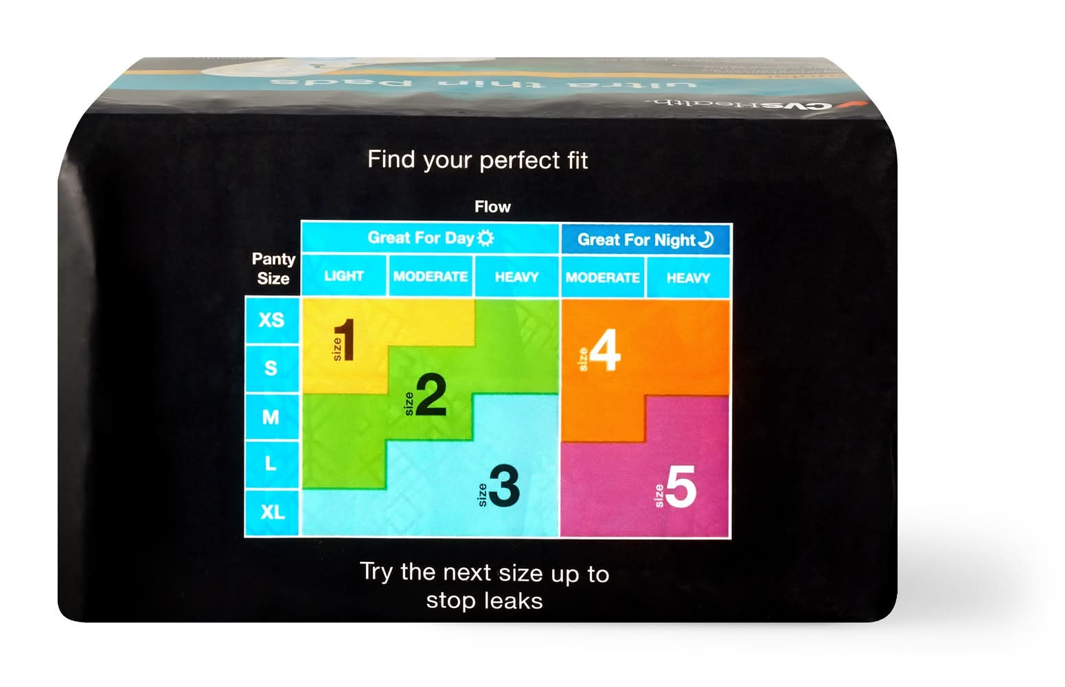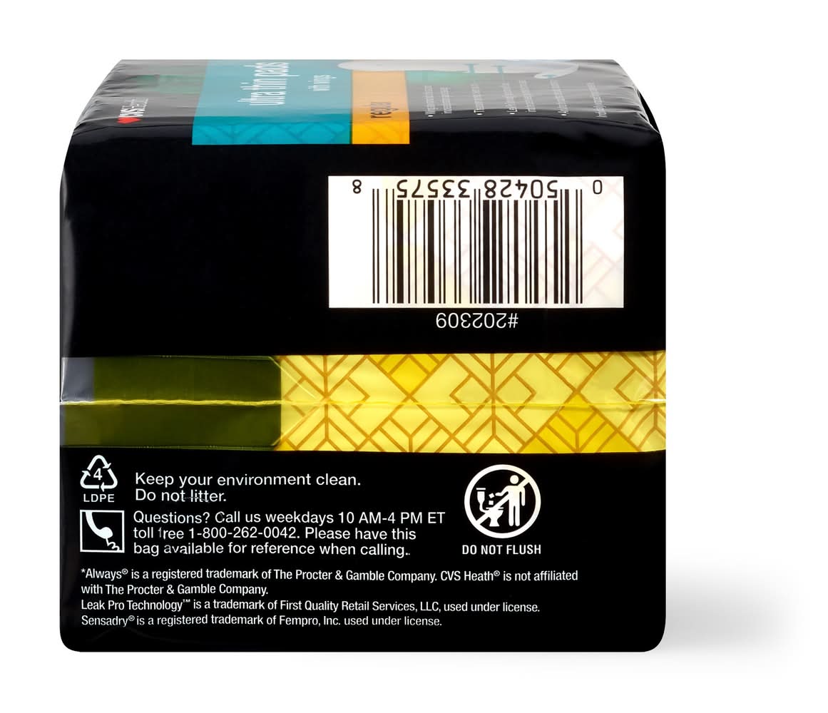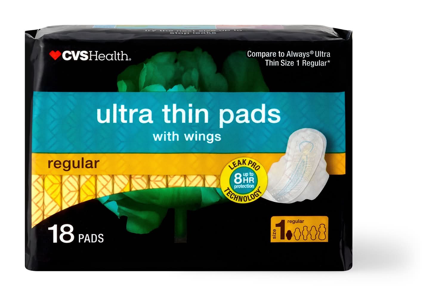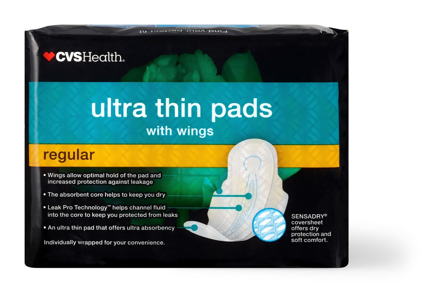 Includes 18 regular pads with wings Individually wrapped for your convenience Wings allow optimal hold of the pad and increased protection against leakage Absorbent core helps keep you dry Ultra-thin pad that offers ultra absorbency HSA/FSA eligible Get the protection you need for light to moderate days of your period with CVS Health Ultra Thin Pads with Wings. With their ultra-thin design, these regular pads are easy to discreetly stash in your pocket. Their individually wrapped design lets you easily place a couple in your bag, locker, or desk drawer. Wings ensure a secure hold of the pad on your underwear and increase protection against pesky leakage. Plus, these pads feature a Sensadry coversheet that offers dry protection and soft comfort. The super-absorbent core also helps keep you feeling fresh and dry. Each pad offers up to eight hours of protection, though it's recommended that you change your pad every four to eight hours to promote good hygiene. These pads are great for use during the day. Directions for use: Lift flap of pouch and remove pad. Keep pouch for disposal. Remove peel strip from pad and press into panties. Peel paper tabs from wings. Wrap wings around sides and attach by pressing to underside of panties. To Dispose: Detach wings from panties and remove pad. Roll or fold pad and place into pouch. Dispose in wastebasket. Do not flush. Important: Keep plastic bags away from children. Size: Regular