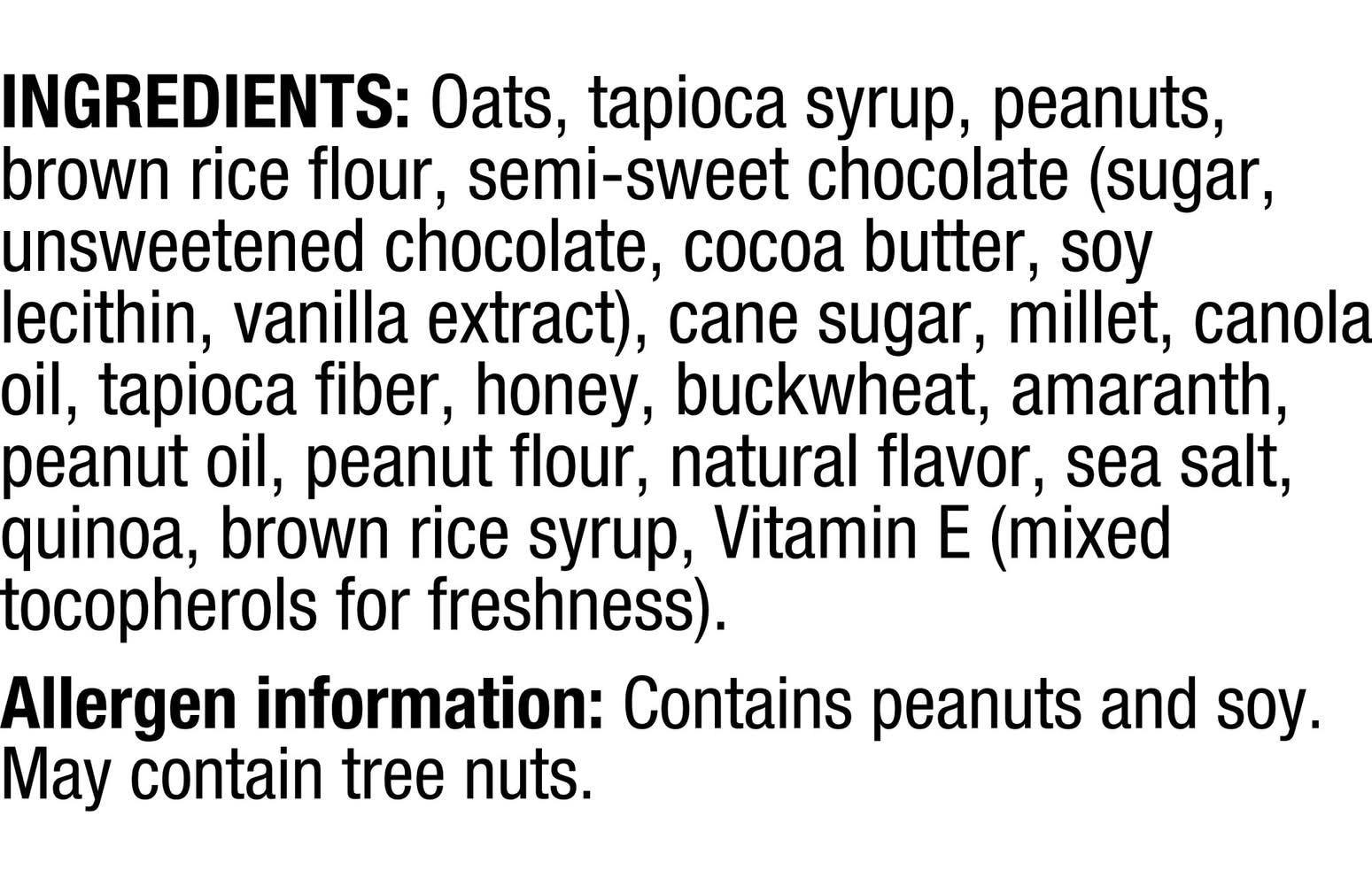 Ingredients: Oats, Tapioca Syrup, Peanuts, Brown Rice Flour, Semi-Sweet Chocolate (Sugar, Unsweetened Chocolate, Cocoa Butter, Soy Lecithin, Vanilla Extract), Cane Sugar, Millet, Canola Oil, Tapioca Fiber, Honey, Buckwheat, Amaranth, Peanut Oil, Peanut Flour, Natural Flavor, Sea Salt, Quinoa, Brown Rice Syrup, Vitamin E (Mixed Tocopherols For Freshness). Contains: Allergen Information: Contains Peanuts And Soy. May Contain Tree Nuts.