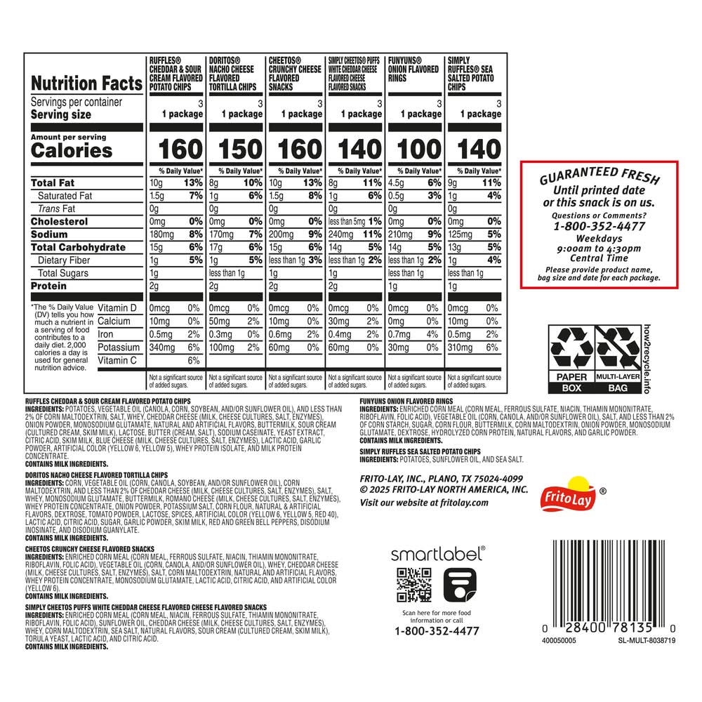 Ingredients: Ruffles Cheddar Sour Cream Flavored Potato Chips Ingredients: Potatoes, Vegetable Oil (Canola, Corn, Soybean, And/Or Sunflower Oil), And Less Than 2% Of Corn Maltodextrin, Salt, Whey, Cheddar Cheese (Milk, Cheese Cultures, Salt, Enzymes), Onion Powder, Monosodium Glutamate, Natural And Artificial Flavors, Buttermilk, Sour Cream (Cultured Cream, Skim Milk), Lactose, Butter (Cream, Salt), Sodium Caseinate, Yeast Extract, Citric Acid, Skim Milk, Blue Cheese (Milk, Cheese Cultures, Salt, Enzymes), Lactic Acid, Garlic Powder, Artificial Color (Yellow 6, Yellow 5), Whey Protein Isolate, And MILK Protein Concentrate. CONTAINS MILK INGREDIENTS. Doritos Nacho Cheese Flavored Tortilla Chips Ingredients: Corn, Vegetable Oil (Corn, Canola, Soybean, And/Or Sunflower Oil), Corn Maltodextrin, And Less Than 2% Of Cheddar Cheese (Milk, Cheese Cultures, Salt, Enzymes), Salt, Whey, Monosodium Glutamate, Buttermilk, Romano Cheese (Milk, Cheese Cultures, Salt, Enzymes), Whey Protein Concentrate, Onion Powder, Potassium Salt Corn Flour, Natural Artificial Flavors, Dextrose, Tomato Powder, Lactose, Spices, Artificial Color (Yellow 6, Yellow 5, Red 40), Lactic Acid, Citric Acid, Sugar, Garlic Powder, Skim Milk, Red And Green Bell Peppers, Disodium Inosinate, And Disodium Guanylate. CONTAINS MILK INGREDIENTS. Cheetos Crunchy Cheese Flavored Snacks Ingredients: Enriched Corn Meal (Corn Meal, Ferrous Sulfate, Niacin, Thiamin Mononitrate, Riboflavin, Folic Acid), Vegetable Oil (Corn, Canola, And/Or Sunflower Oil), Whey, Cheddar Cheese (Milk, Cheese Cultures, Salt, Enzymes), Salt, Corn Maltodextrin, Natural And Artificial Flavors, Whey Protein Concentrate, Monosodium Glutamate, Lactic Acid, Citric Acid, And Artificial Color (Yellow 6), . CONTAINS MILK INGREDIENTS. Simply Cheetos Puffs White Cheddar Cheese Flavored Cheese Flavored Snacks Ingredients: Enriched Corn Meal (Corn Meal, Niacin, Ferrous Sulfate, Thiamin Mononitrate, Riboflavin, Folic Acid), Sunflower Oil, Cheddar Cheese (Milk, Cheese Cultures, Salt, Enzymes), Whey, Corn Maltodextrin, Sea Salt, Natural Flavors, Sour Cream (Cultured Cream, Skim Milk), Torula Yeast, Lactic Acid, And Citric Acid. CONTAINS MILK INGREDIENTS. Funyuns Onion Flavored Rings Ingredients: Enriched Corn Meal (Corn Meal, Ferrous Sulfate, Niacin, Thiamin Mononitrate, Riboflavin, Folic Acid), Vegetable Oil (Corn, Canola, And/Or Sunflower Oil), Salt, And Less Than 2% Of Corn Starch, Sugar, Corn Flour, Buttermilk, Corn Maltodextrin, Onion Powder, Monosodium Glutamate, Dextrose, Hydrolyzed Corn Protein, Natural Flavors, And Garlic Powder. CONTAINS MILK INGREDIENTS. Simply Ruffles Sea Salted Potato Chips Ingredients: Potatoes, Sunflower Oil, And Sea Salt. Contains: Contains Milk Ingredients.