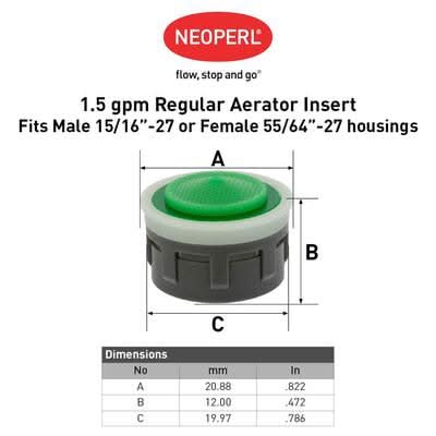 This 1.5 GPM Water Saving Faucet Aerator Insert by NEOPERL is WaterSense certified and can save you up to 30% water compared to using the standard 2.2 GPM aerator. It has an anti-liming Honeycomb screen and produces a soft aerated water flow. Use when you need to replace the insert only in your original faucet housing.