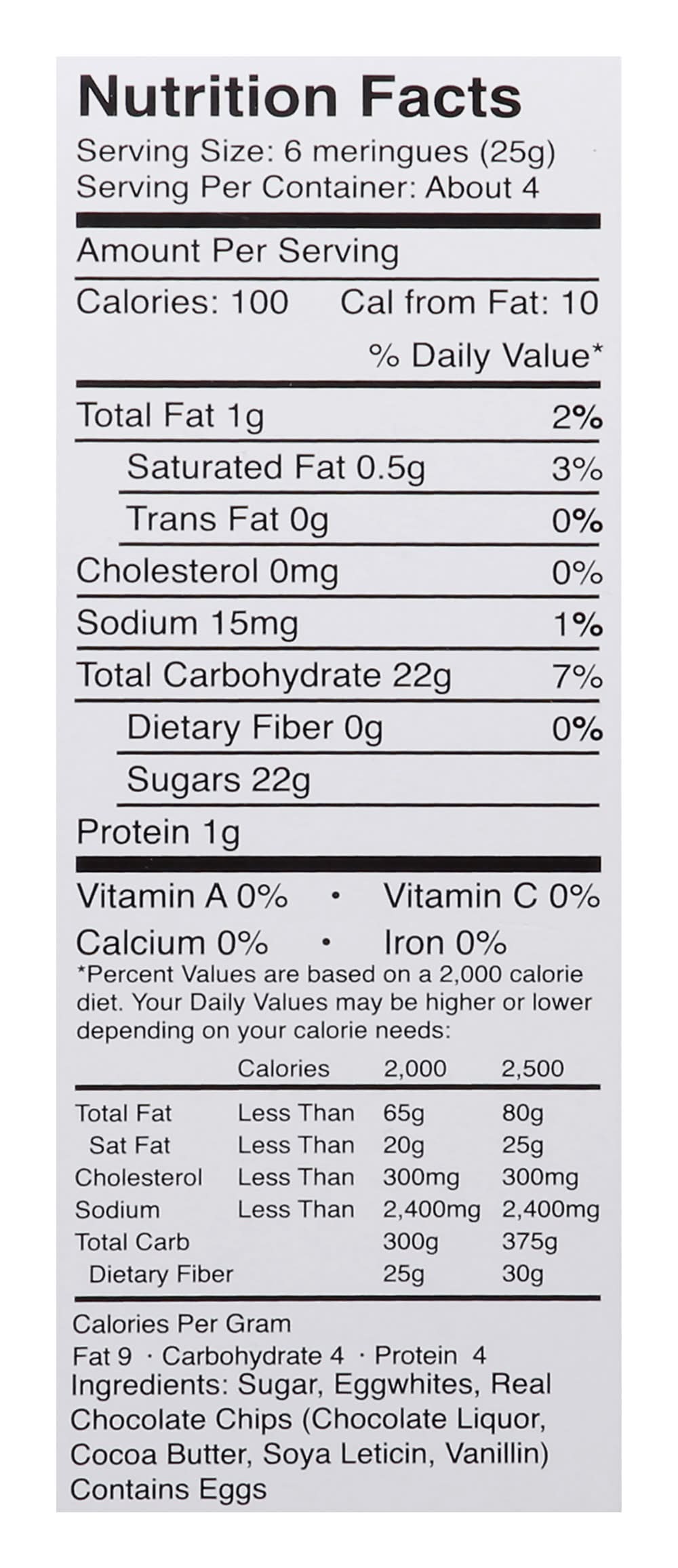 Sugar, Eggwhites, Real Chocolate Chips (Chocolate Liquor Cocoa Butter Soya Lecithin Vanillin) Contains: Eggs, Soybeans Additives: None