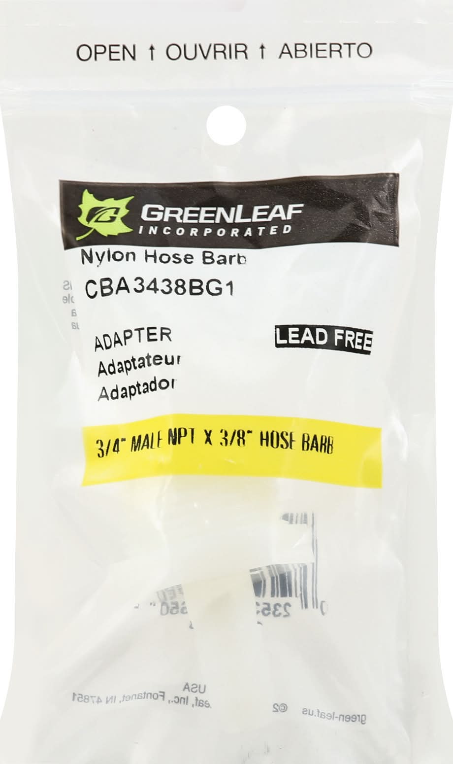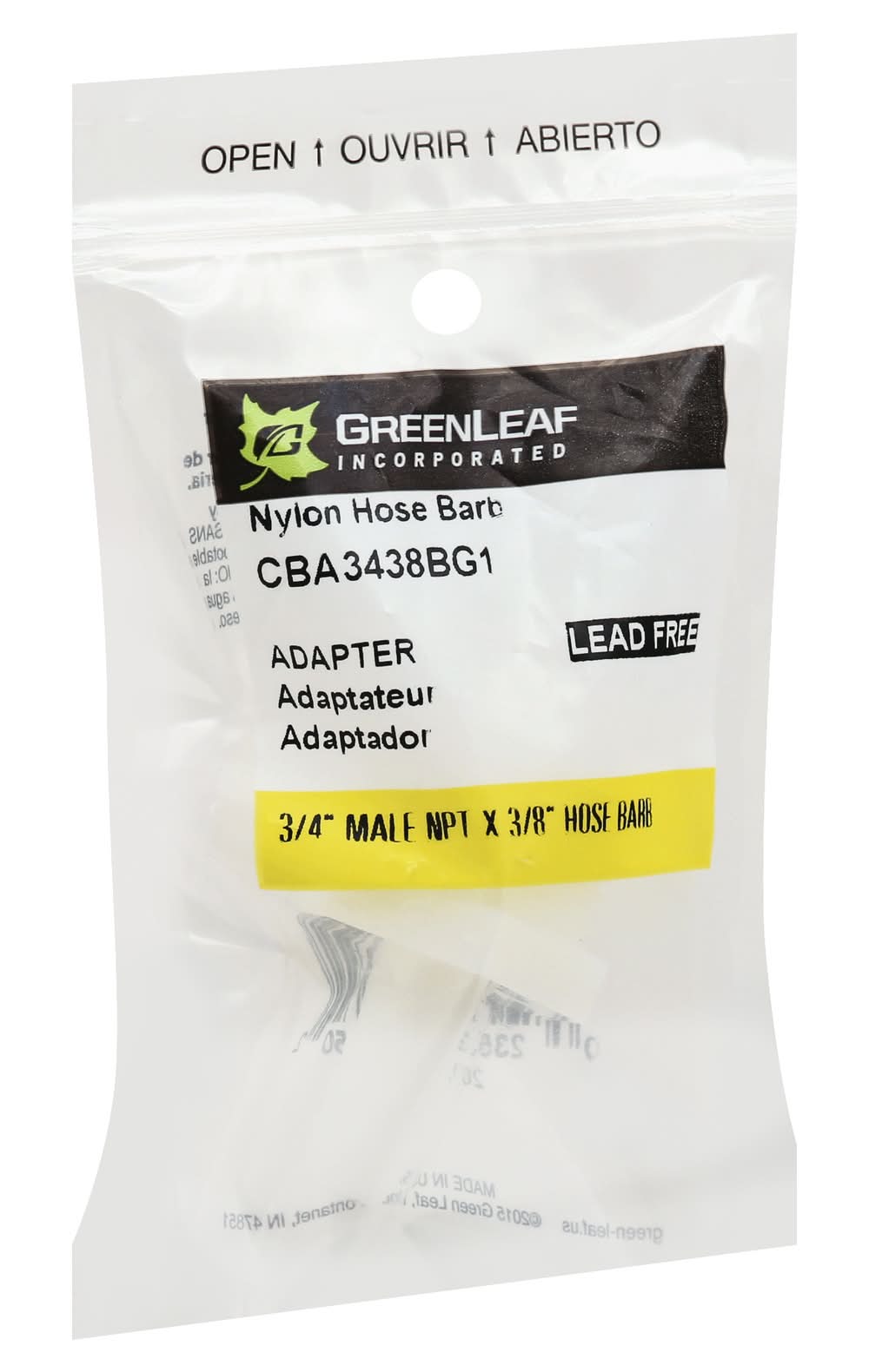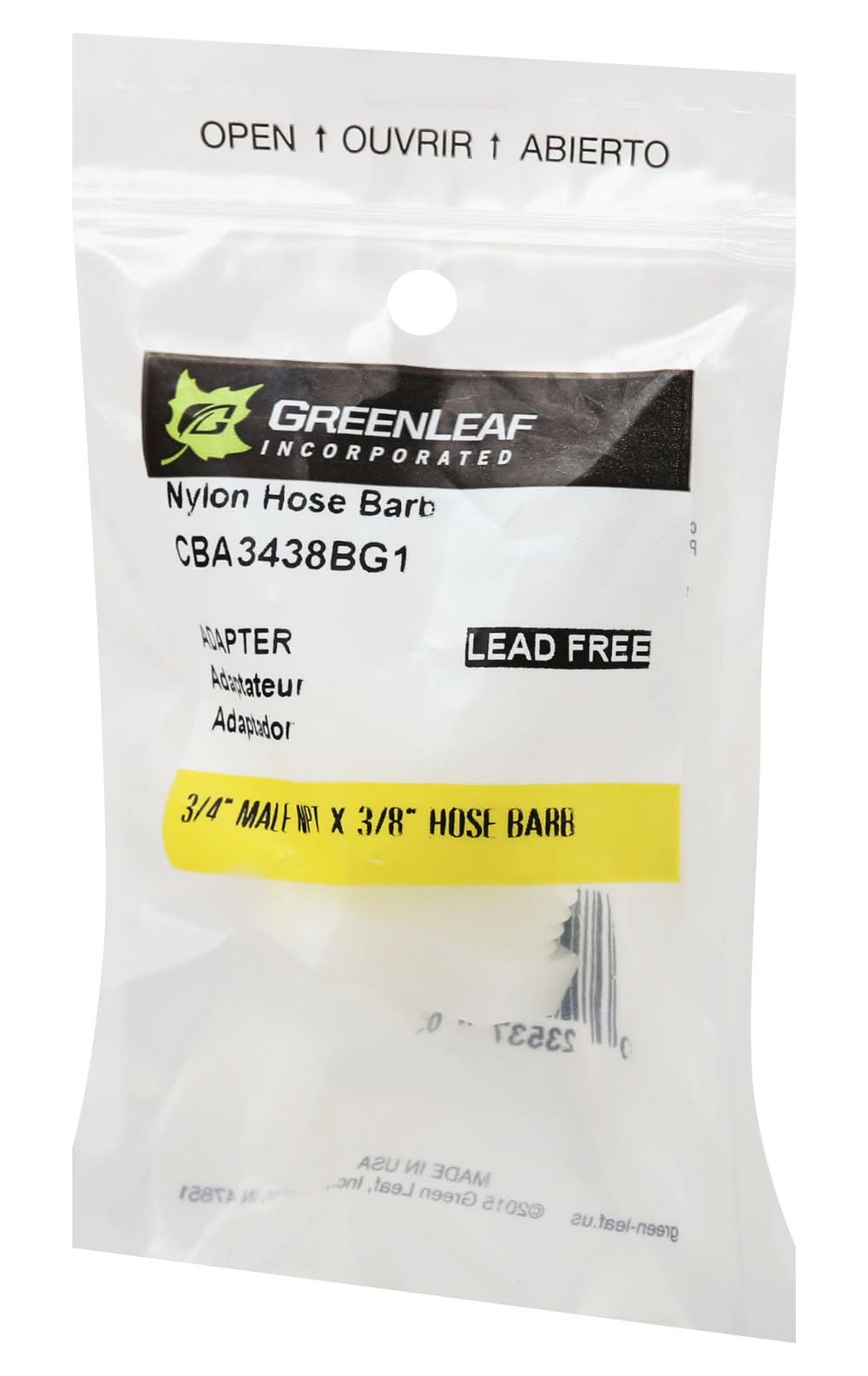 3/4 inch male NPT x 3/8 inch hose barb. Lead free. The wetted surface of this product contacted by consumable water contains less than 0.25% of lead by weight. Certified to NSF/ANSI 61 & 372. green-leaf.us. Made in USA. Green Leaf,
