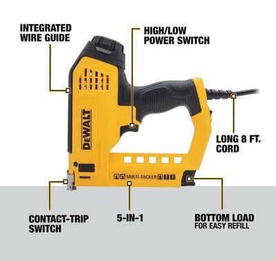 The DEWALT Electric Multi-Tacker loads a variety of staples and brads from heavy duty, narrow, cable, 18-Gauge brads and 18-Gauge headless brads. Due to the variety of staples and brads that the is compatible with, there are numerous applications for this tool such as installing carpet, installing sheets of insulation and attaching lightweight trim using the brads, to name a few. This tacker is bottom-loading and makes loading user
