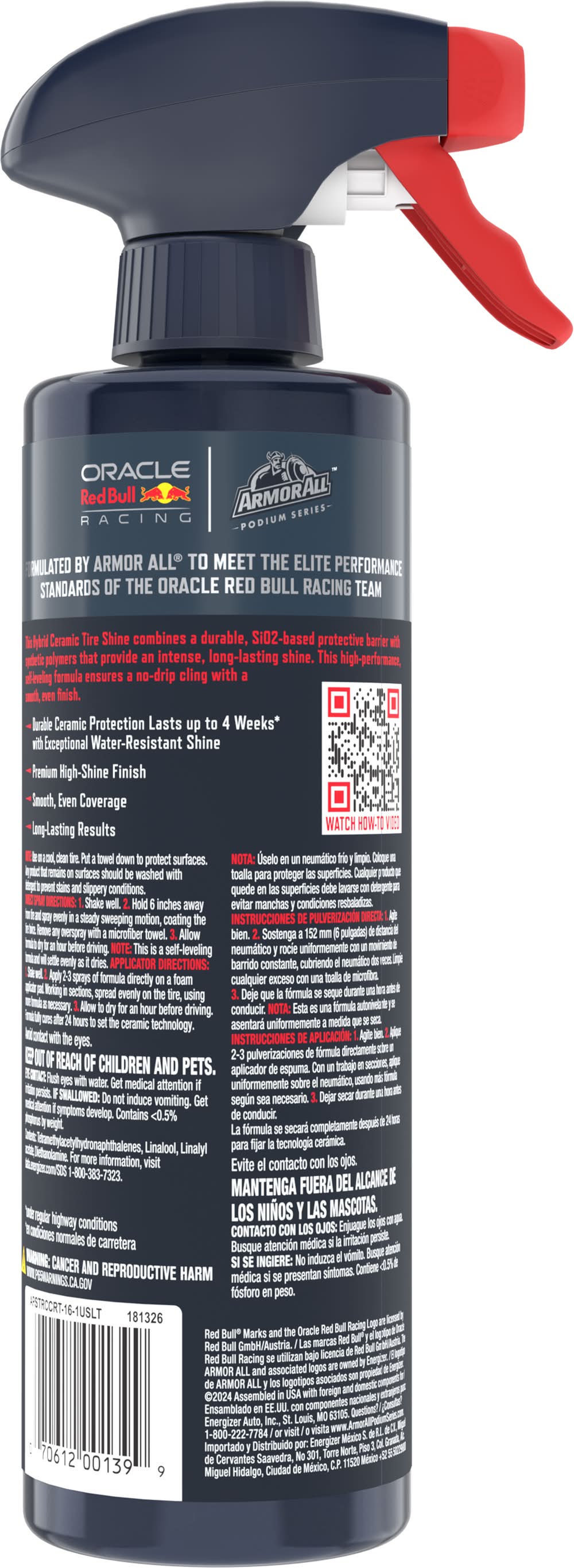 One 16 fl oz bottle of Armor All Podium Series™ Hybrid Ceramic High Gloss Tire Shine Spray. SiO2-based ceramic technology leaves a long-lasting protective barrier. Synthetic polymers transform tires with an intense and durable high gloss shine. Hybrid ceramic tire shine spray that clings to tires without dripping and self-levels to a smooth, even finish. High gloss car tire shine is durable enough to last up to 4 weeks and can withstand several car washes and rain exposure. Precision spray trigger delivers optimized application, ensuring the tire shine is evenly applied and dries to a high-shine finish that lasts. The perfect last step in your wheel and tire regimen, this high gloss tire spray leaves tires protected and shining, with a warm, bold, and invigorating woody scent. For CA Residents Only: WARNING: This product can expose you to chemicals including Lead which are known to the State of California to cause cancer and birth defects or other reproductive harm. For more information go to www.P65Warnings.ca.gov.