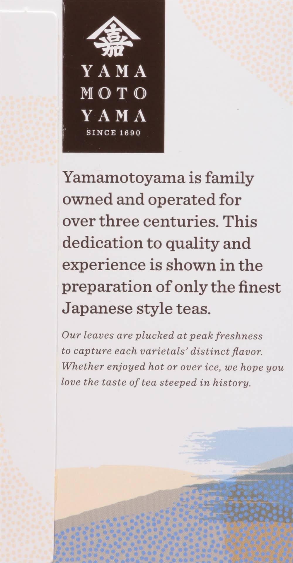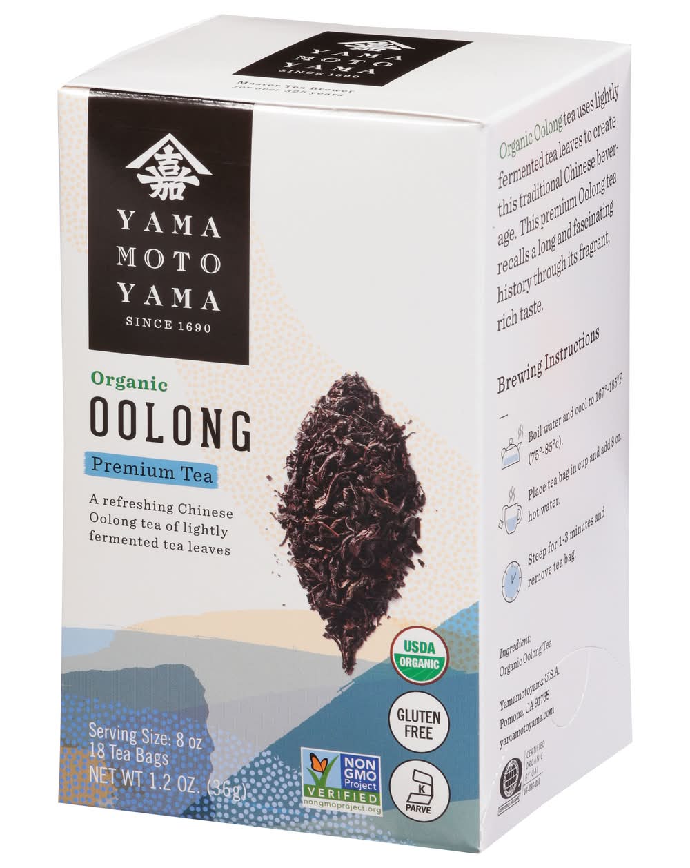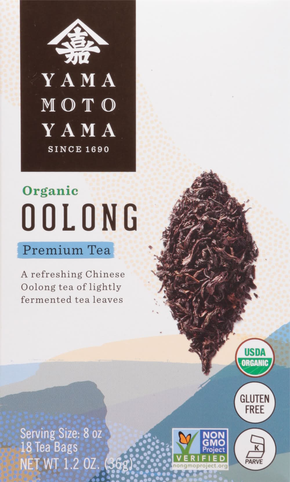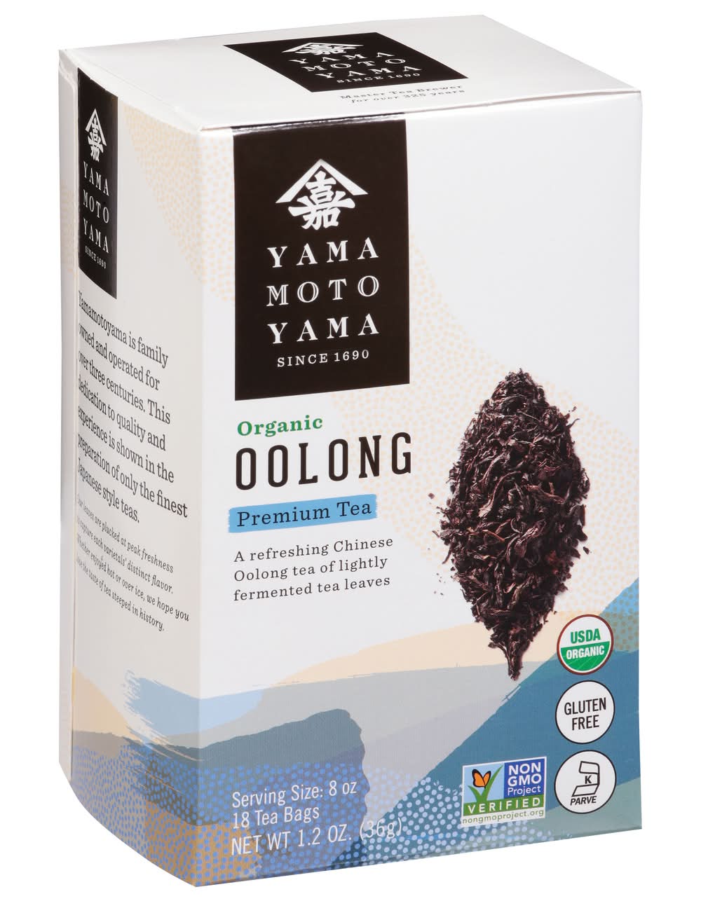 USDA Organic. Certified Organic: Quality Assurance International. Gluten free. Certified Organic BY QAI. Non-GMO Project verified. nongmoproject.org. Since 1690. A refreshing Chinese Oolong tea of lightly fermented tea leaves. Master Tea Brewer for over 325 years. Yamamotoyama is family owned and operated for over three centuries. This dedication to quality and experience is shown in the preparation of only the finest Japanese style teas. Our leaves are plucked at peak freshness to capture each varietals' distinct flavor. Whether enjoyed hot or over ice, we hope you love the taste of tea steeped in history. Organic Oolong tea uses lightly fermented tea leaves to create this traditional Chinese bever- age. This premium Oolong tea recalls a long and fascinating history through its fragrant, rich taste. yamamotoyama.com.