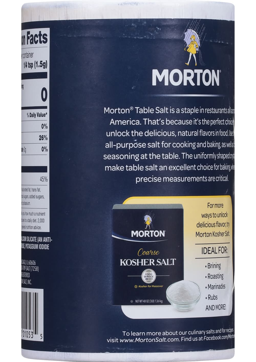 Morton Table Salt is a staple in your restaurants all across America. That's because it's the perfect choice to unlock the delicious, natural flavors in food. You can use this all-purpose salt for cooking, as well as for seasoning at the table. Because of its uniformly shaped crystals, the table salt is an excellent choice for baking, where precise measurements are critical. Morton Salt,
