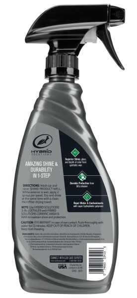 Turtle Wax Hybrid Solutions Ceramic Wet Wax is a car care product that is applied by spraying onto a wet surface of a clean vehicle. It features super hydrophobic and SiO2 polymers that offer durable protection while providing a ceramic shine. The product enhances the vehicle's color depth with superior shine and high gloss. It also offers instant water repelling and chemical resistant protection. The application process is straightforward: wash the car, spray the wax on, and then dry. Additionally, it emits a sweet fruity fragrance.