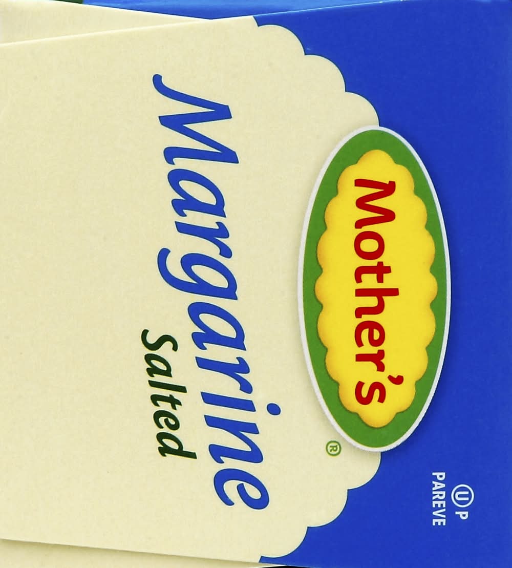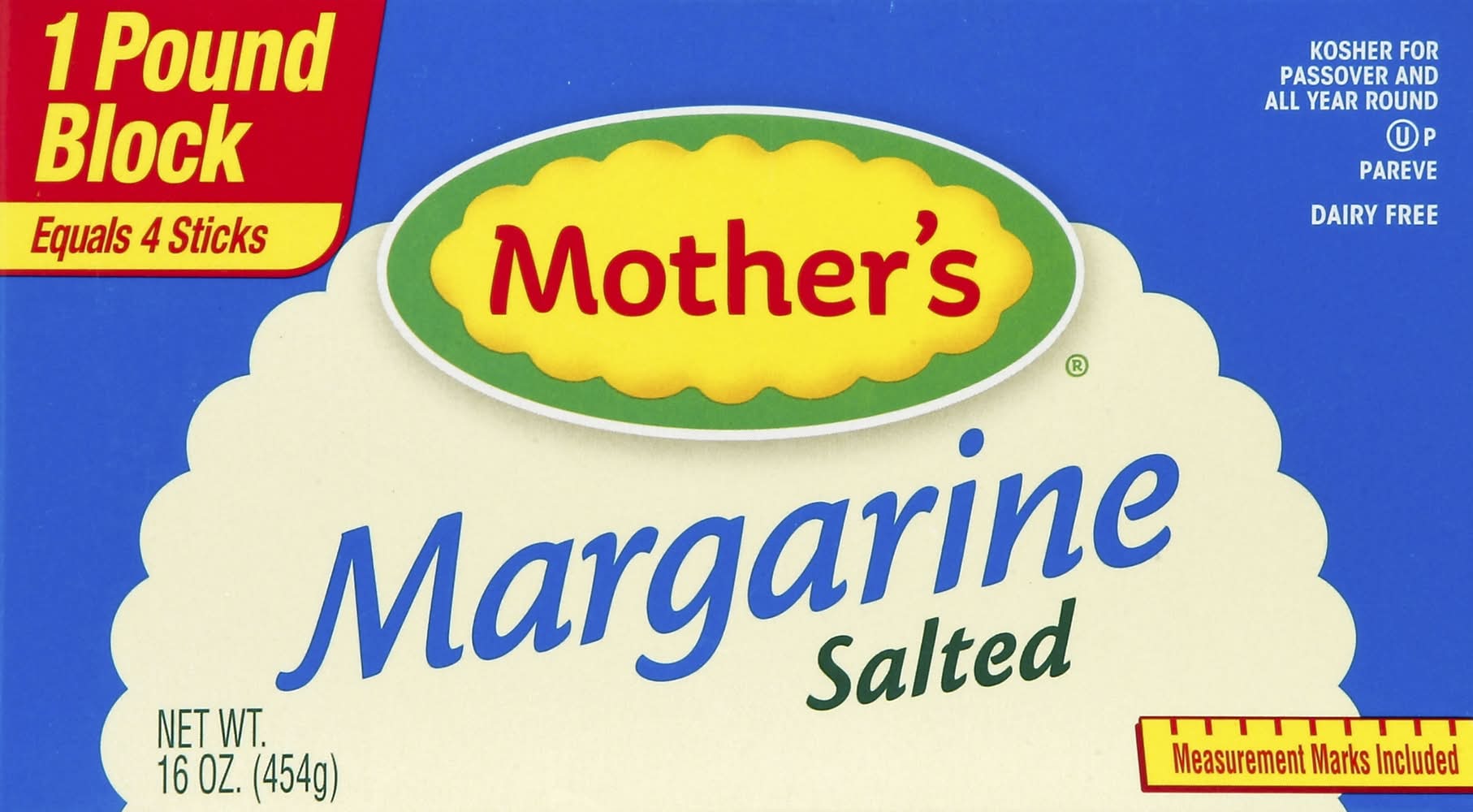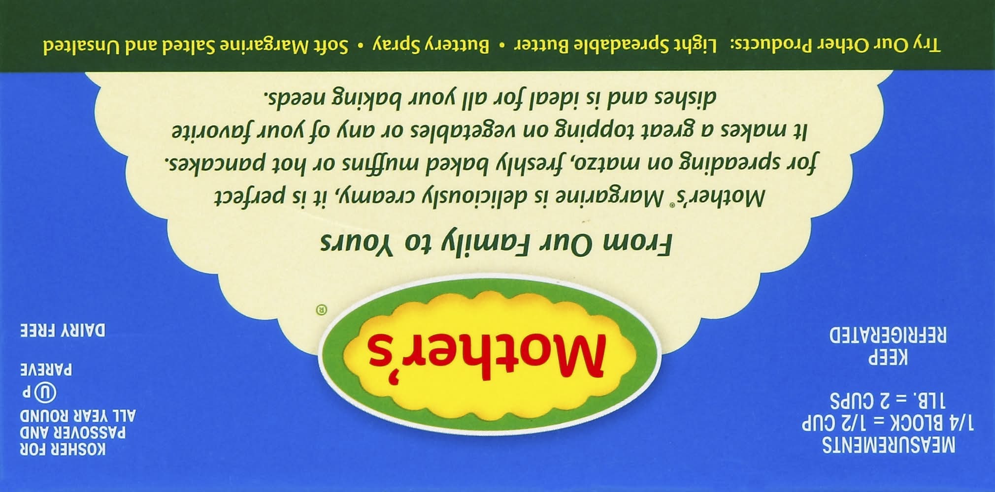 1 pound block. Equals 4 sticks. Kosher for passover and all year round. Dairy free. Measurement marks included. From our Family to Yours: Mother's Margarine is deliciously creamy, it is perfect for spreading on matzo, freshly baked muffins or hot pancakes. It makes a great topping on vegetables or any of your favorite dishes and is ideal for all your baking needs. Product of USA. MANISCHEWITZ,
