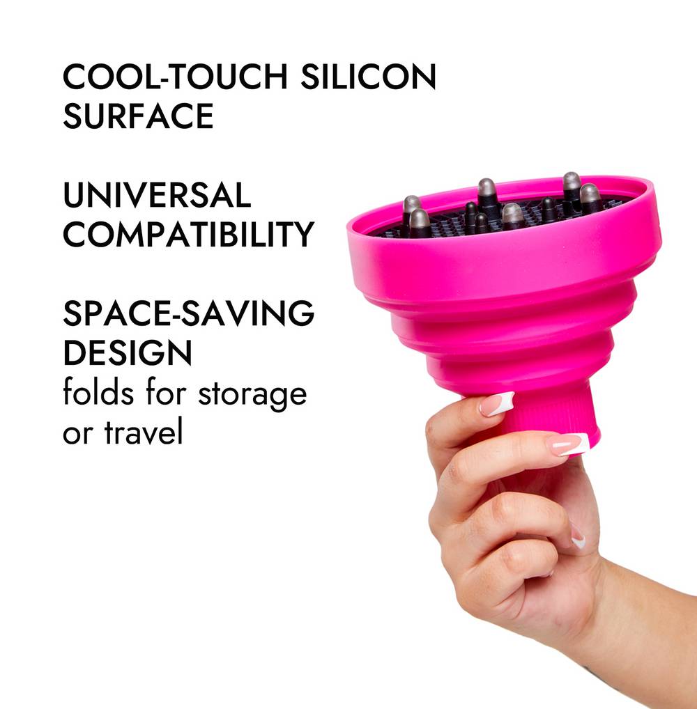 Indulge in the pinnacle of blow-drying luxury with the elevating your hairstyling experience to new heights. Crafted with heat-resistant materials, this innovative diffuser boasts a cool-touch silicon surface, allowing you to style your hair safely at temperatures up to 450°F. Embrace its space-saving design, perfect for both storage and travel, ensuring you can achieve superior results anywhere. With a versatile diffuser opening diameter of 2 1/8 inches, it effortlessly accommodates nearly any dryer and brand, offering universal compatibility. Transform your daily routine into a salon-quality styling session with this exceptional diffuser, where efficiency, portability and high performance converge to redefine your hairstyling possibilities. This diffuser spreads the blow-dryer’s airstream over a broader area in a more controlled manner. It’s the perfect addition to your curly or wavy hair routine. It helps dry your curl type in a way that reduces frizz and defines your pattern. Experience the art of effortless and flawless styling with the ion Universal Pink Diffuser.