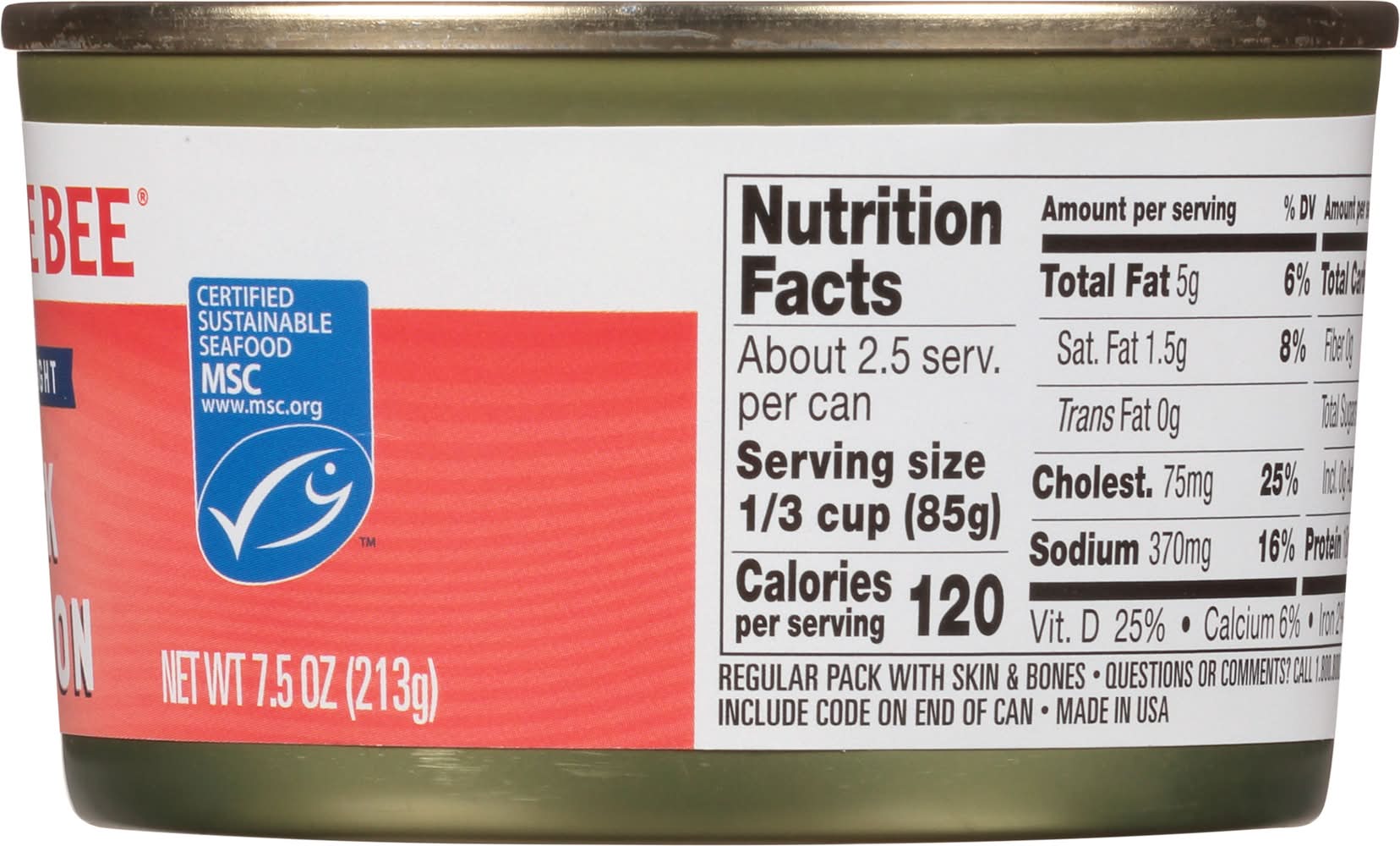 18 g protein (See nutrition information for cholesterol content) per serving. Gluten free. Regular pack with skin & bones. tracemycatch.com. bumblebee.com. Questions or comments? Call 1.800.800.8572. Include code on end of can. MSC: Certified sustainable seafood. msc.org. From an MSC certified sustainable fishery. www.msc.org. Recycle me. Wild caught. Made in USA.