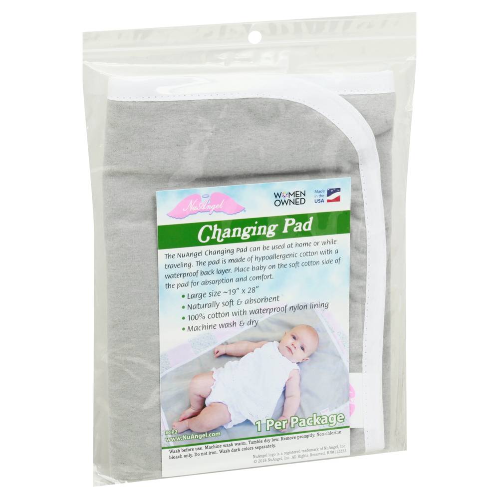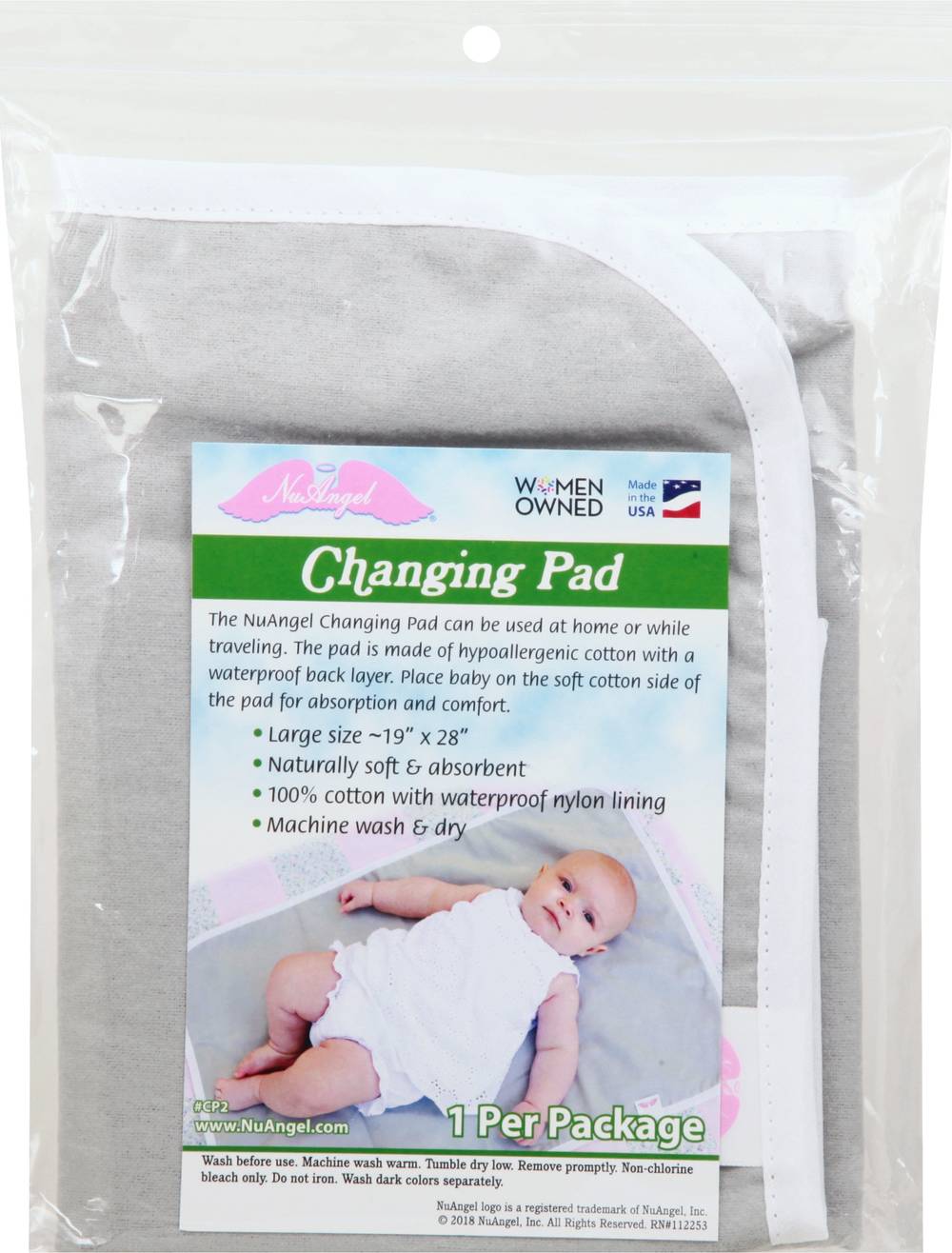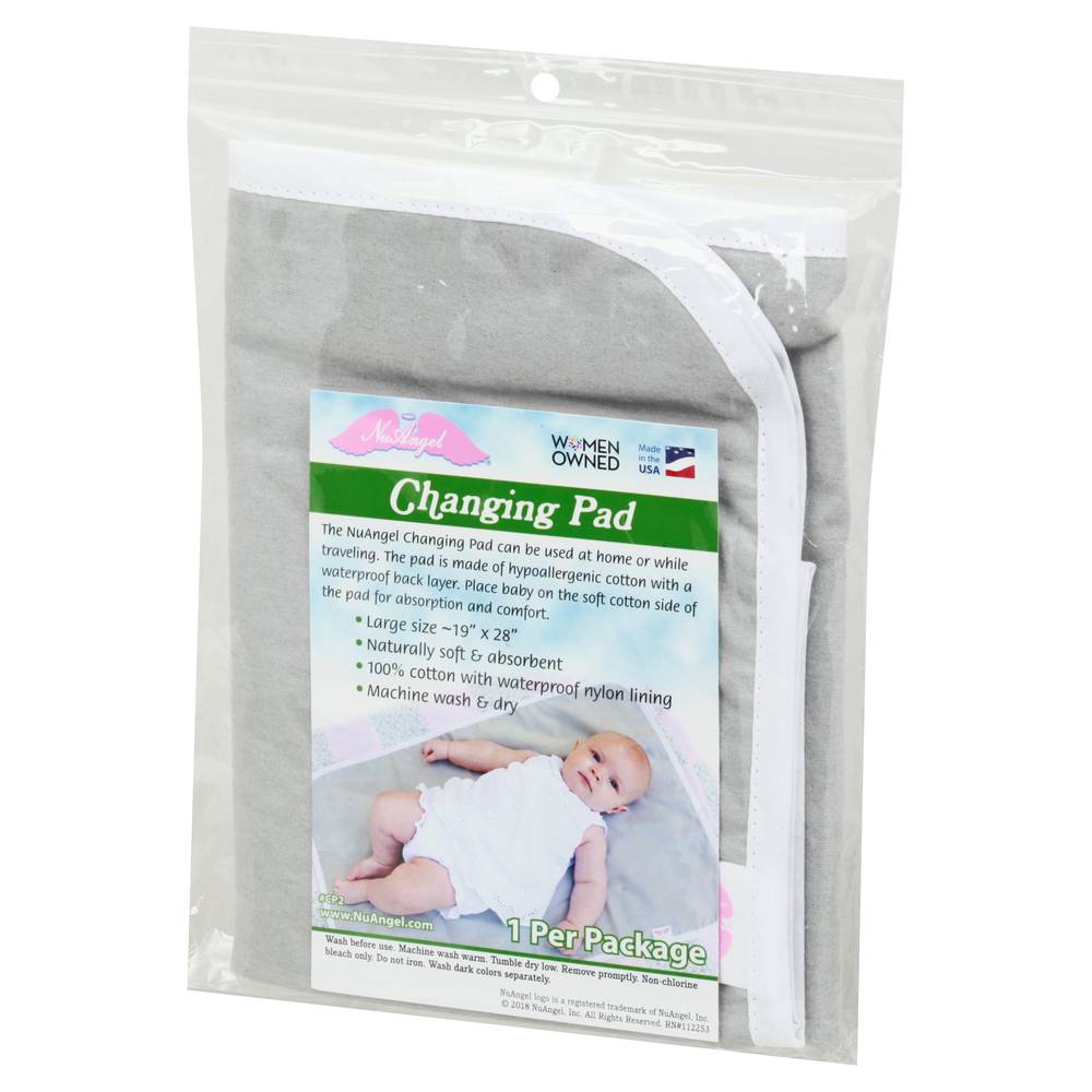 Large size - 19 inches x 28 inches. The NuAngel Changing Pad can be used at home or while traveling. The pad is made of hypoallergenic cotton with a waterproof back layer. Place baby on the soft cotton side of the pad for absorption and comfort. Naturally soft & absorbents. 100% cotton with waterproof nylon lining. Machine wash & dry. www.NuAngel.com. Women Owned. Made in the USA. NuAngel,