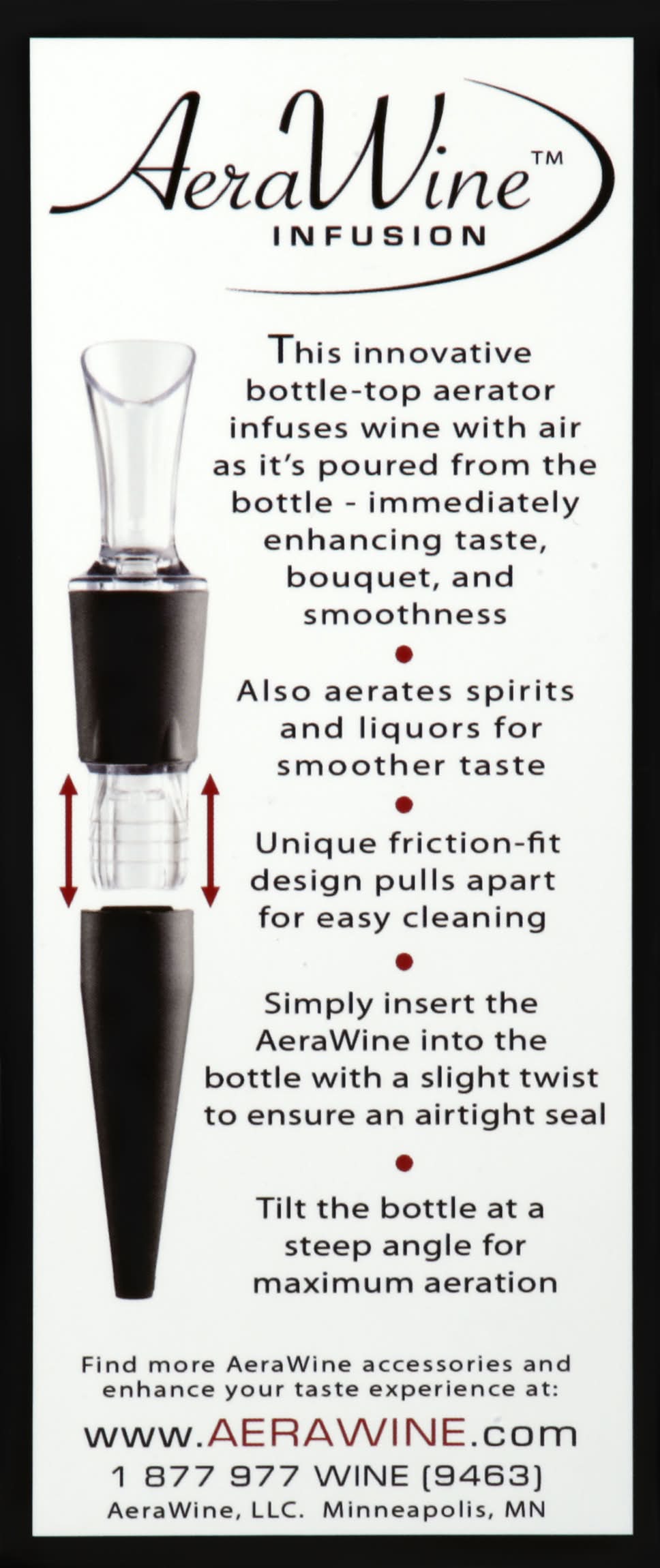 Directions: Simply insert the AeraWine into the bottle with a slight twist to ensure an airtight seal. Tilt the bottle at a steep angle for maximum aeration.