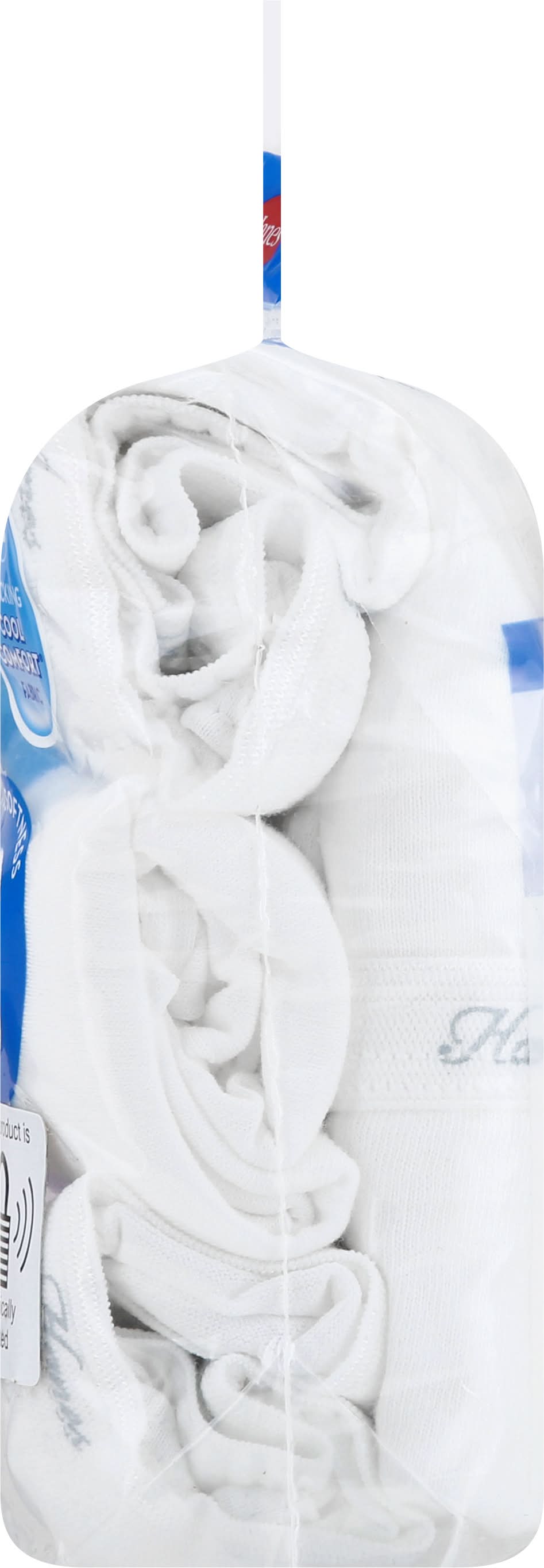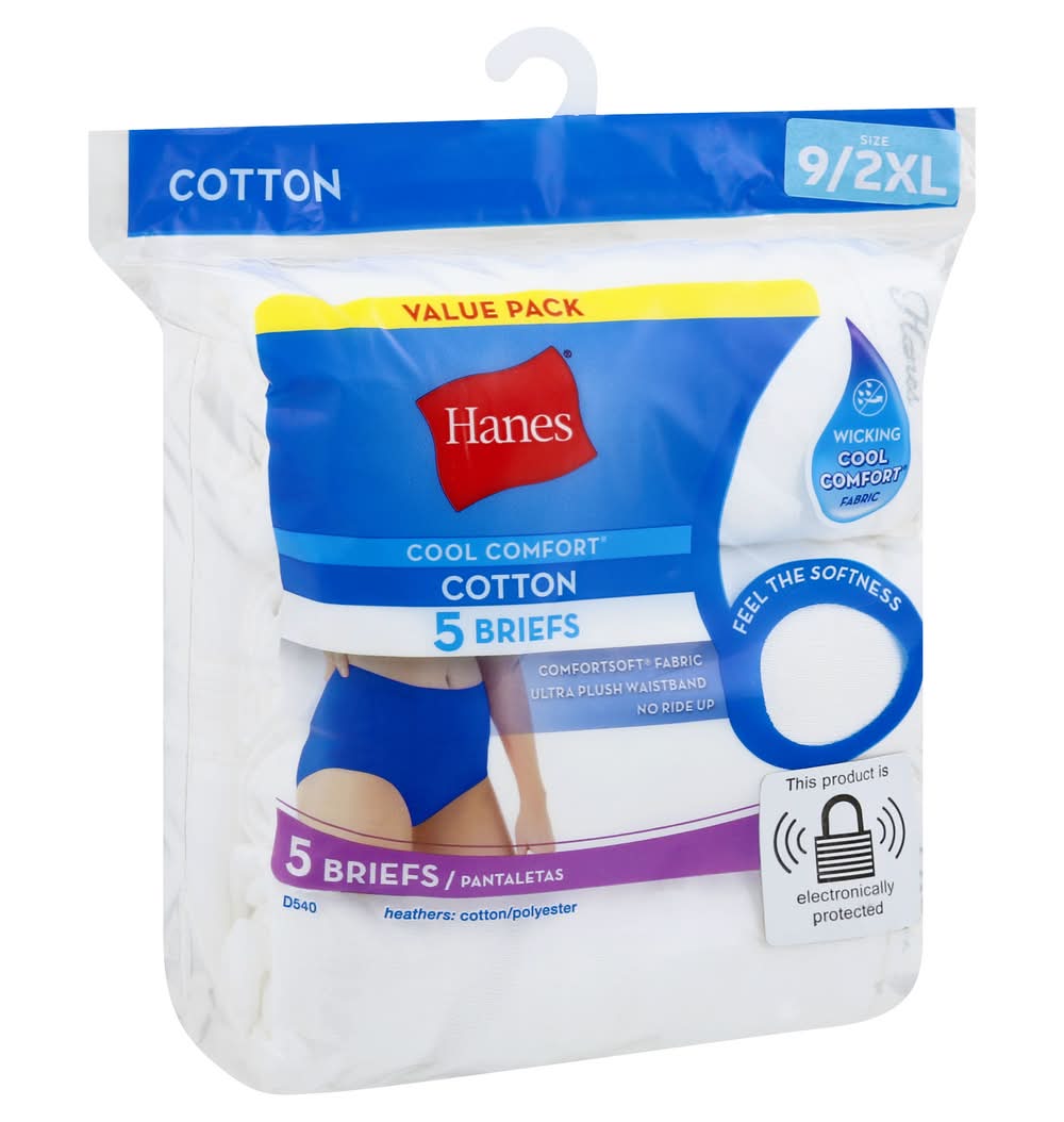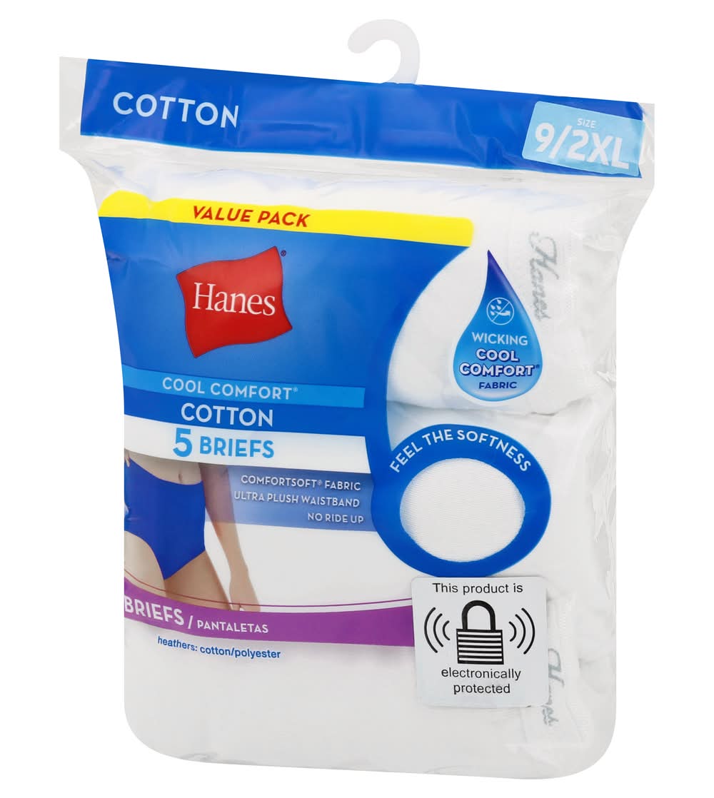 Wicking Cool Comfort fabric. Comfortsoft fabric ultra plush waistband no ride up. Feel the softness. This product is electronically protected. Heathers: cotton/polyester. Brief covers you beautifully-high rise, full coverage. Tagless Brief: No more scratchy labels. Moisture Wicking: Breathable Cool Comfort fabric. No ride up: Stay in place design. Size: 6/M. Hip/inches: 38-39 inches (97-99 cm). Pant Size: 8-10; Size: 7/L. Hip/inches: 40-41 inches (102-104 cm). Pant Size: 12-14; Size:8/XL. Hip/inches: 42-43 inches (107-109 cm). Pant Size: 14-16; Size: 9. Hip/inches: 44-45 inches (112-114 cm). Pant Size: 16-18; Size: 10. Hip/inches: 46-47 inches (117-119 cm). Pant Size: 18-20. Satisfaction Guarantee: Your satisfaction important to us. If you are not pleased with this product, return it to the address below. You will receive a replacement, of available, or a refund. Hanes.com/panties. Facebook. Questions? 1-800-994-4348. Hanes.com/panties. Please recycle plastic products. Made in EL Salvador. • Hanesbrands, • Packaging: Reusable