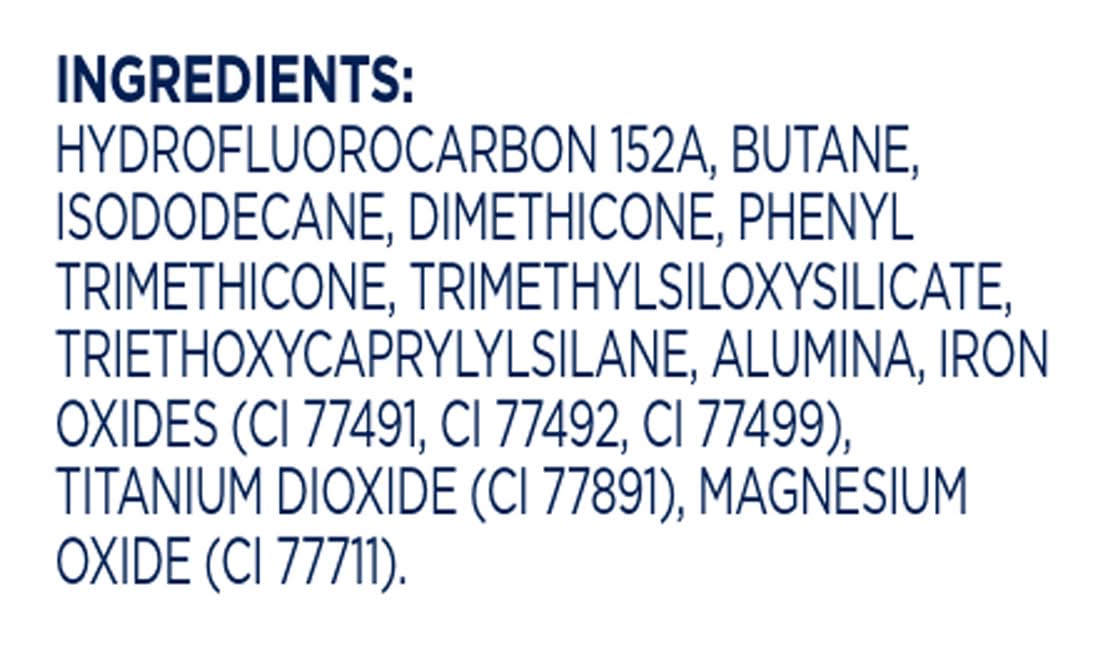 Ingredients: Hydrofluorocarbon Is2a, Butane, Isododecane, Iron Oxides (CI 77499), Dimethicone, Phenyl Trimethicone, Iron Oxides (CI 77492), Iron Oxides (CI 77491), Trimethylsiloxysilicate, Triethoxycaprylylsilane, Titanium Dioxide (CI 77891), Alumina, Magnesium Oxide