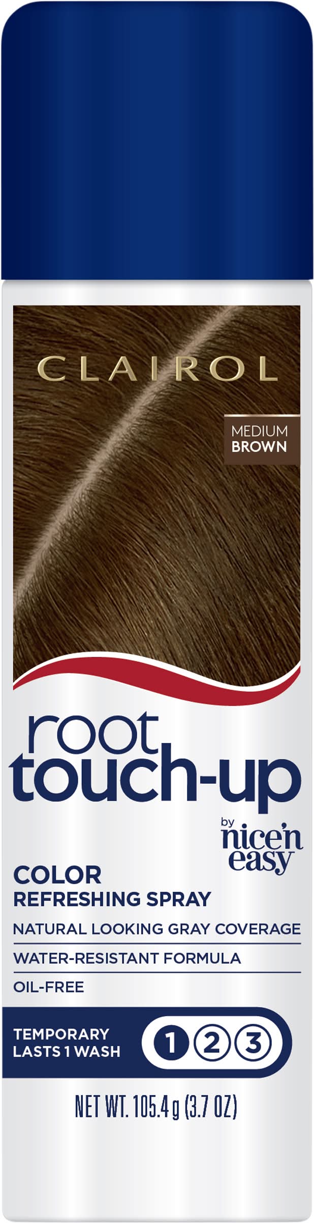 By Nicen easy. Natural looking gray coverage. Water-resistant formula. Oil-free. Temporary lasts 1 wash. Spray away gray in seconds. Instantly restore color and cover grays. Our blend of pigments are designed to work with your color for natural looking results that last 1 shampoo. Oil-free, peroxide-free and ammonia-free. Perfect for: Fast drying coverage on-the-go; Covering high amounts of gray. www.Clairol.com. Or search for Clairol on facebook messenger to chat with us! Questions? Call the Expert Color Consultants at 1-800-Clairol (1-800-252-4765), visit our website at www.Clairol.com. Made in Germany. • Coty Inc., New York,NY,10118 • Packaging: Reusable