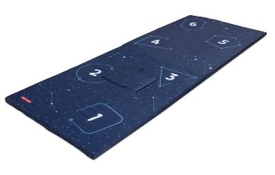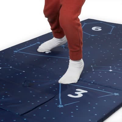 The Tent to Tumble Play Mat is a new, versatile playtime favorite. With two ways to play, the Tent to Tumble Play Mat brings hours of fun. Easily switch from a cozy play tent to tumble mat in seconds – just disconnect the clips, Velcro the doors together, and flip the tent over. Tent mode features a fun peek-a-boo window and Mat Mode features an exciting hopscotch game. Kids will also find numbers, shapes, and constellations for a fun learning experience in Mat Mode. Equipped with water resistant fabric, this tent and play mat is ready for adventure and easily wipes clean. Recommended for 9 months – 3 years.