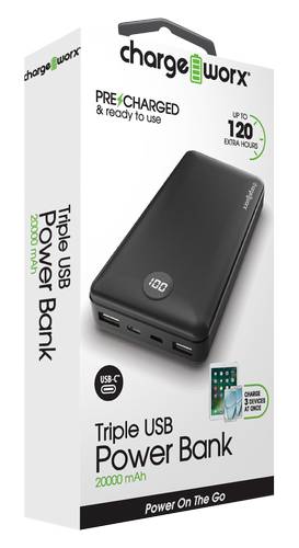Equipped with dual USB ports, the Chargeworx Triple USB Power Bank enables simultaneous charging of two devices. It features a charging indicator to display the battery's charge status. With a 20000mAh capacity, it strikes a balance between portability and sufficient battery life, offering approximately two to three full charges for most devices, catering to the needs of those frequently on the move.