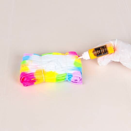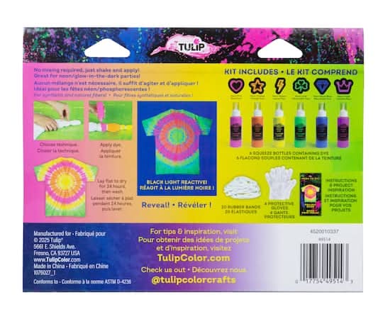 Use this neon tie dye kit to create a fabulously unique T-shirt that's made by you! You just add water to the squeeze bottles, shake and apply the dye using the tie-dye technique for the result you want. Includes assorted pieces . Blacklight reactive. No mixing required. Includes instructions and project inspiration . For use with synthetic and natural fibers.