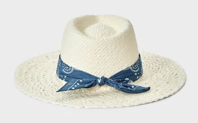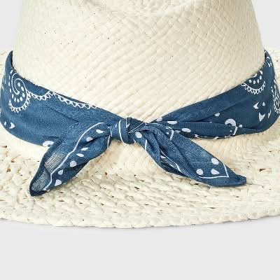 Top off your look and stay cool in this Straw Fedora Hat with Bandana Detail from Universal Thread. Made from 100% paper, it's lightweight, perfect for sun-soaked summer days, and includes a removable blue bandana. Use the back hoop and loop fastener to swap out different bandanas and add a stylish accent that complements any outfit. • Color: White • Size: S/M