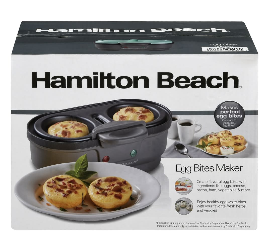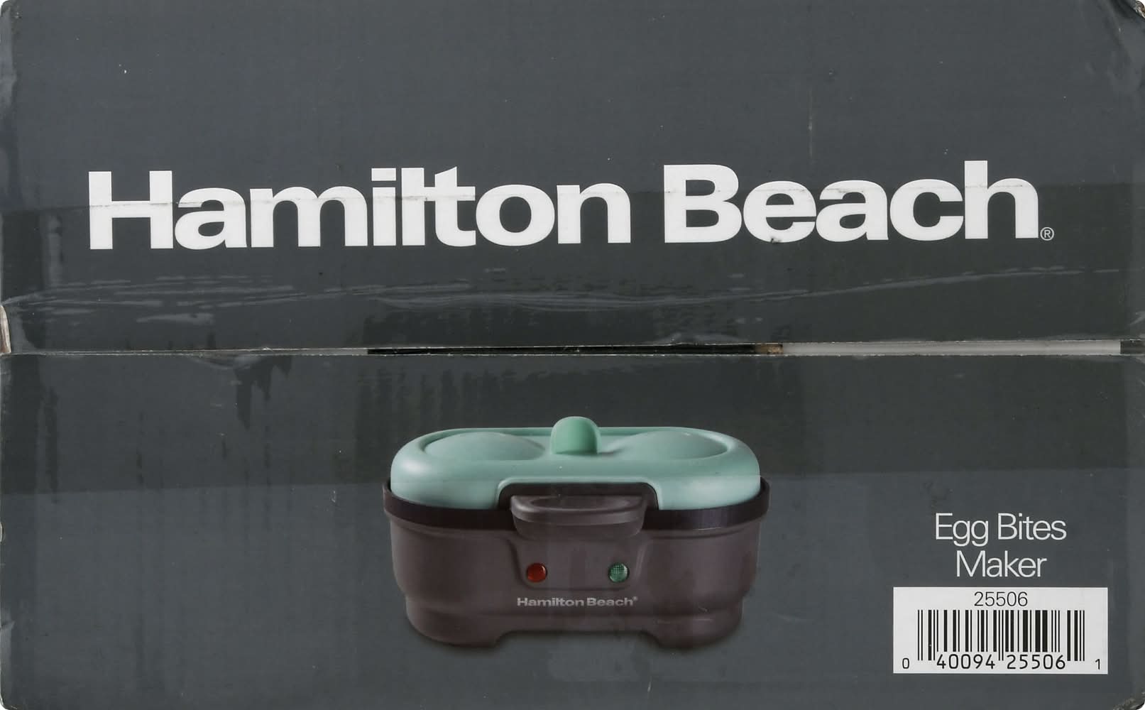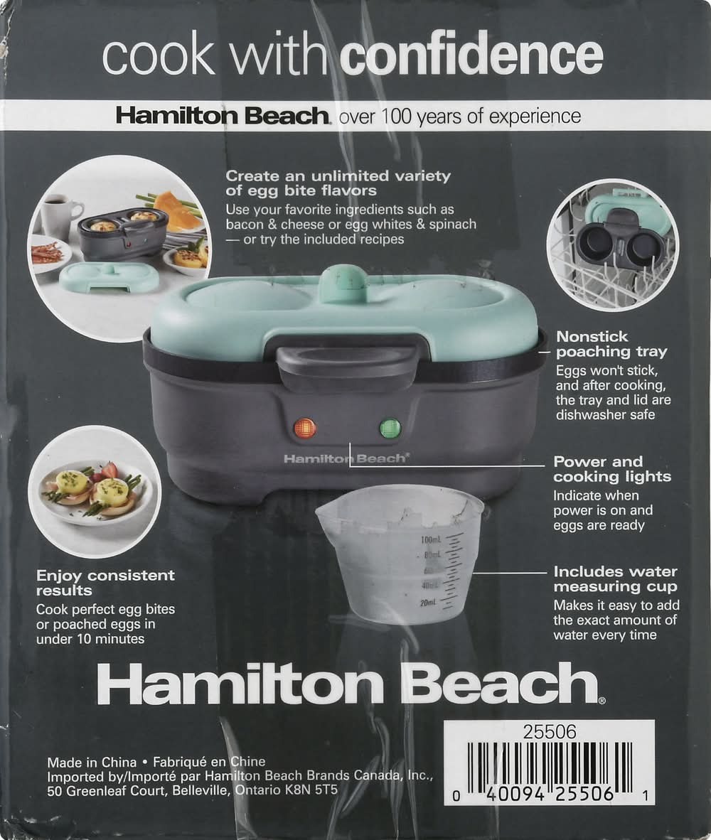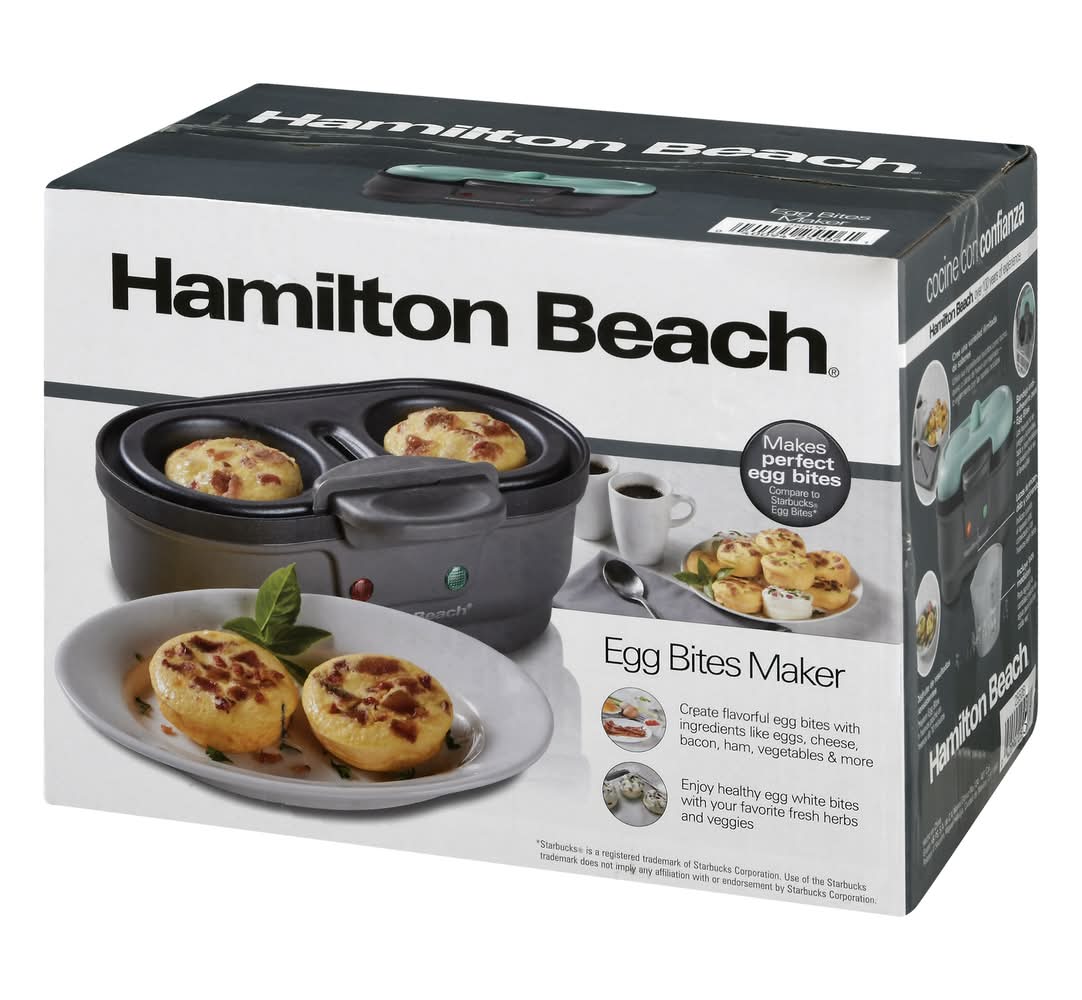 Makes perfect egg bites. Compare to Starbucks Egg Bites (Starbucks is a registered trademark of Starbucks Corporation, use the of the Starbucks trademark does not imply any affiliation with or endorsement by Starbucks Corporation). Create flavorful egg bites with ingredients like eggs, cheese, bacon, ham, vegetables & more. Enjoy healthy egg white bites with your favorite fresh herbs and veggies. Enclosed product may vary slightly from that shown in photograph. For household use only. Hamilton Beach over 100 years of experience. Create an unlimited variety of egg bite flavors. Use your favorite ingredients such as bacon & cheese or egg whites & spinach or try the included recipes. Nonstick poaching tray. Egg's wont stick and after cooking, the tray and lid are dishwasher safe. Power and cooking lights. Indicate when power is on and eggs are ready. Includes water measuring cup. Makes it easy to add the exact amount of water evert time. Enjoy consistent results. Cook perfect egg bites or poached eggs in under 10 minutes. ETL listed - Intertek. www.hamiltonbeach.com. Questions? USA: 1-800-851-8900; www.hamiltonbeach.com. Recyclable carton in the few communities that recycle paperboard. Made in China. HAMILTON BEACH,