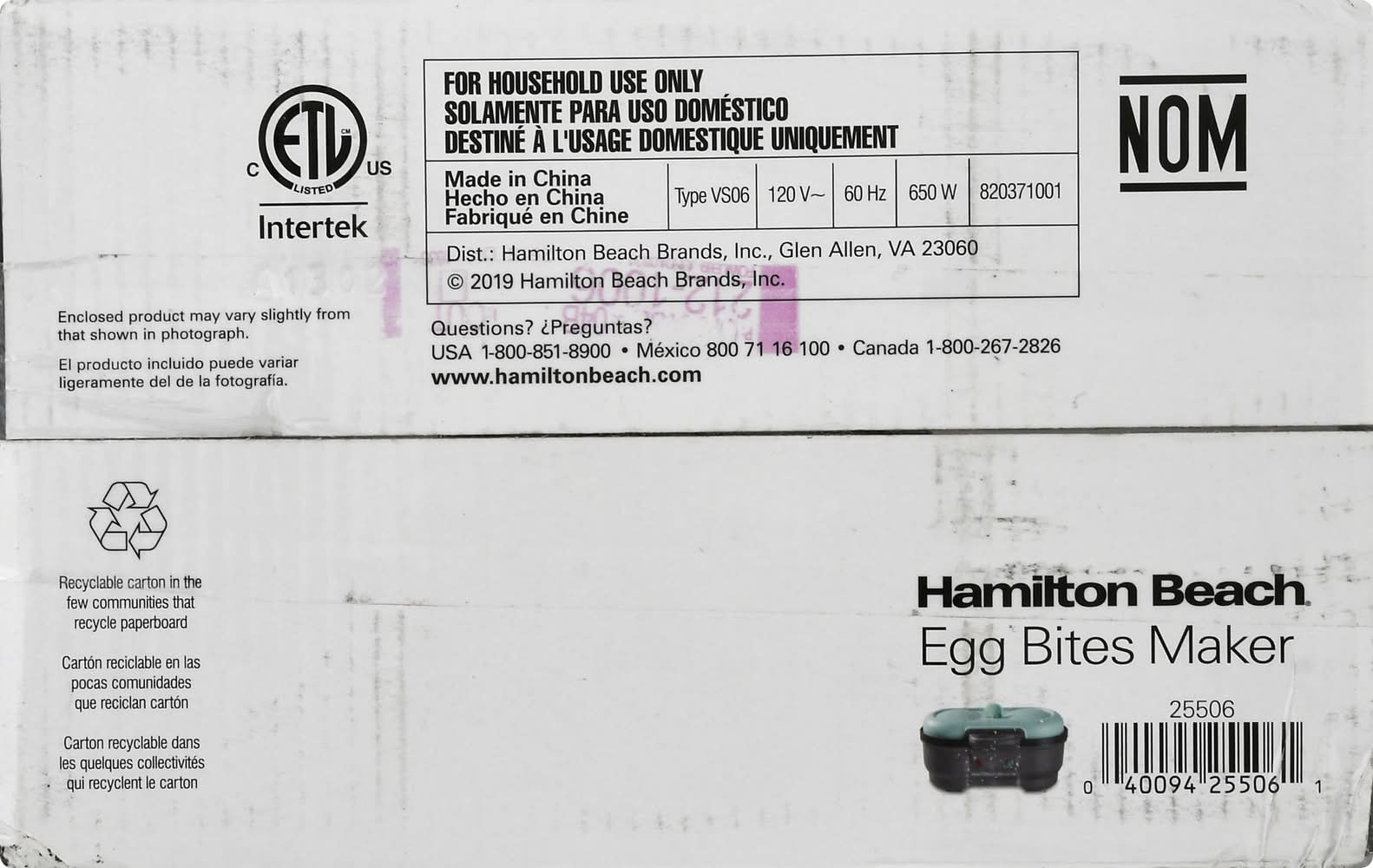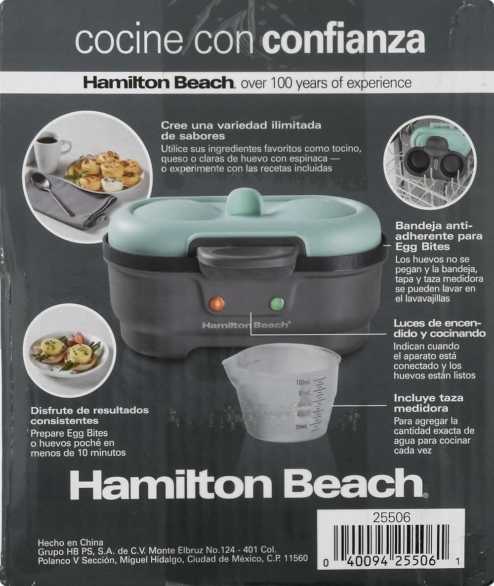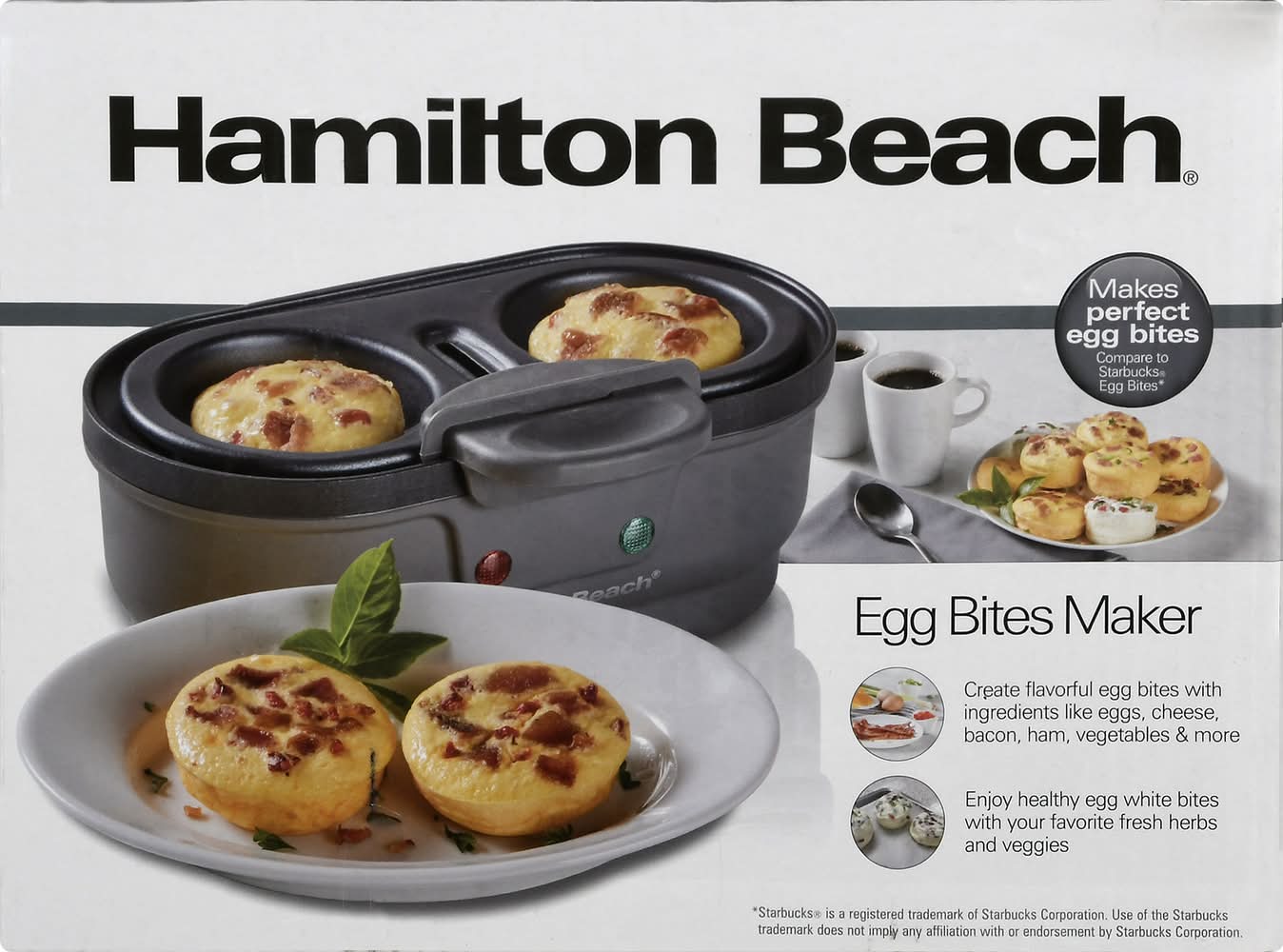 Makes perfect egg bites. Compare to Starbucks Egg Bites (Starbucks is a registered trademark of Starbucks Corporation, use the of the Starbucks trademark does not imply any affiliation with or endorsement by Starbucks Corporation). Create flavorful egg bites with ingredients like eggs, cheese, bacon, ham, vegetables & more. Enjoy healthy egg white bites with your favorite fresh herbs and veggies. Enclosed product may vary slightly from that shown in photograph. For household use only. Hamilton Beach over 100 years of experience. Create an unlimited variety of egg bite flavors. Use your favorite ingredients such as bacon & cheese or egg whites & spinach or try the included recipes. Nonstick poaching tray. Egg's wont stick and after cooking, the tray and lid are dishwasher safe. Power and cooking lights. Indicate when power is on and eggs are ready. Includes water measuring cup. Makes it easy to add the exact amount of water evert time. Enjoy consistent results. Cook perfect egg bites or poached eggs in under 10 minutes. ETL listed - Intertek. www.hamiltonbeach.com. Questions? USA: 1-800-851-8900; www.hamiltonbeach.com. Recyclable carton in the few communities that recycle paperboard. Made in China. HAMILTON BEACH,
