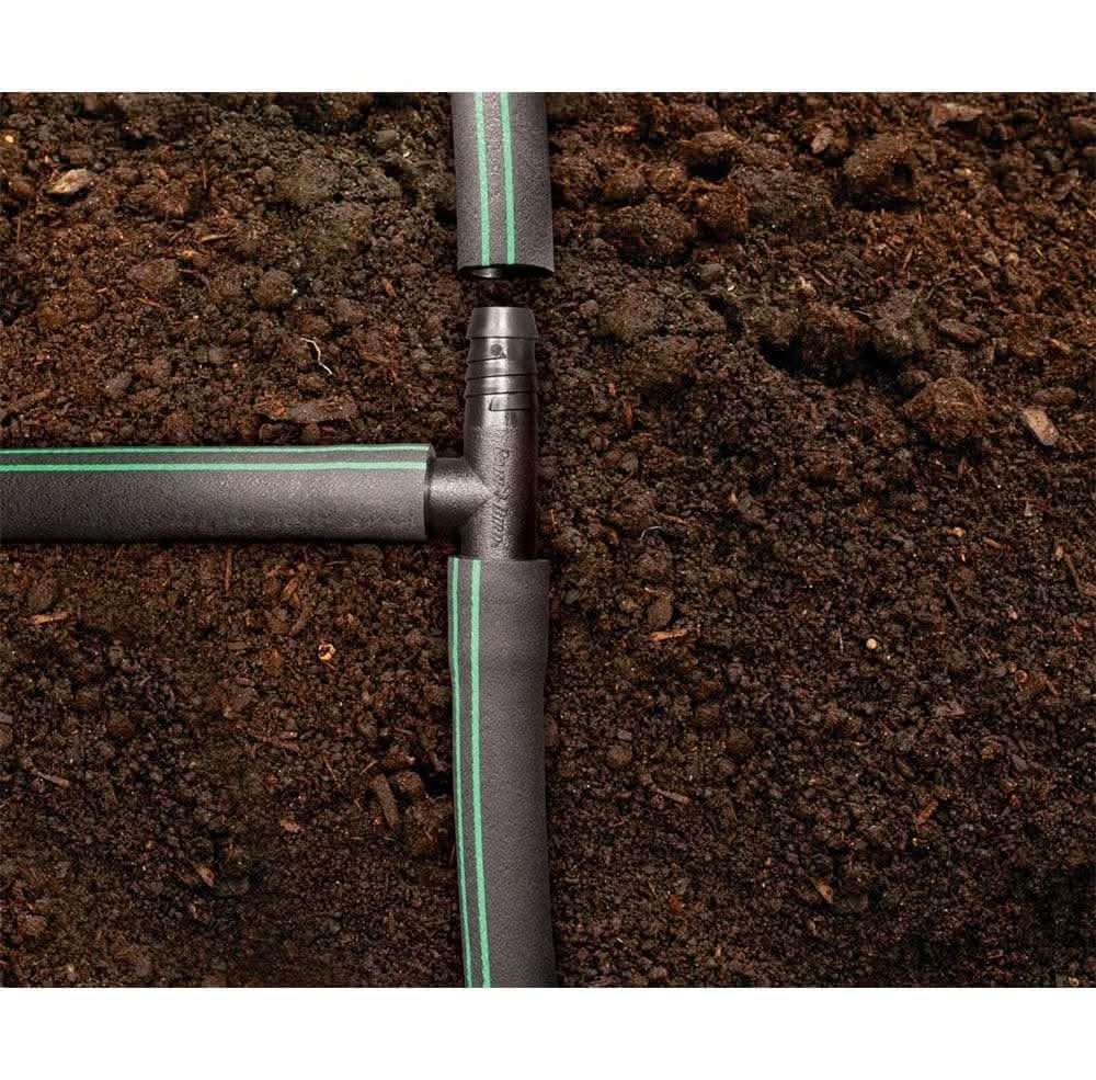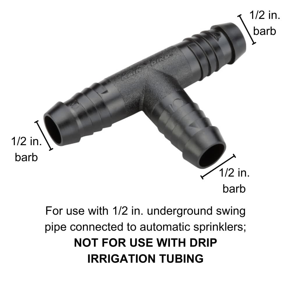 For use with underground sprinkler systems only and not for use with drip tubing. Allows easy parallel connection of sprinkler heads to main irrigation line. Tee coupling with three 1/2-in barbed ends. Extended barbs and aggressive design help prevent blowouts. Easy twist-in barb insertion. Water tight seal. Use with 1/2-in swing pipe to create adjustable fittings. Helps absorb shock from mowers and other traffic. 1/2-in barb x 3. Color: Black