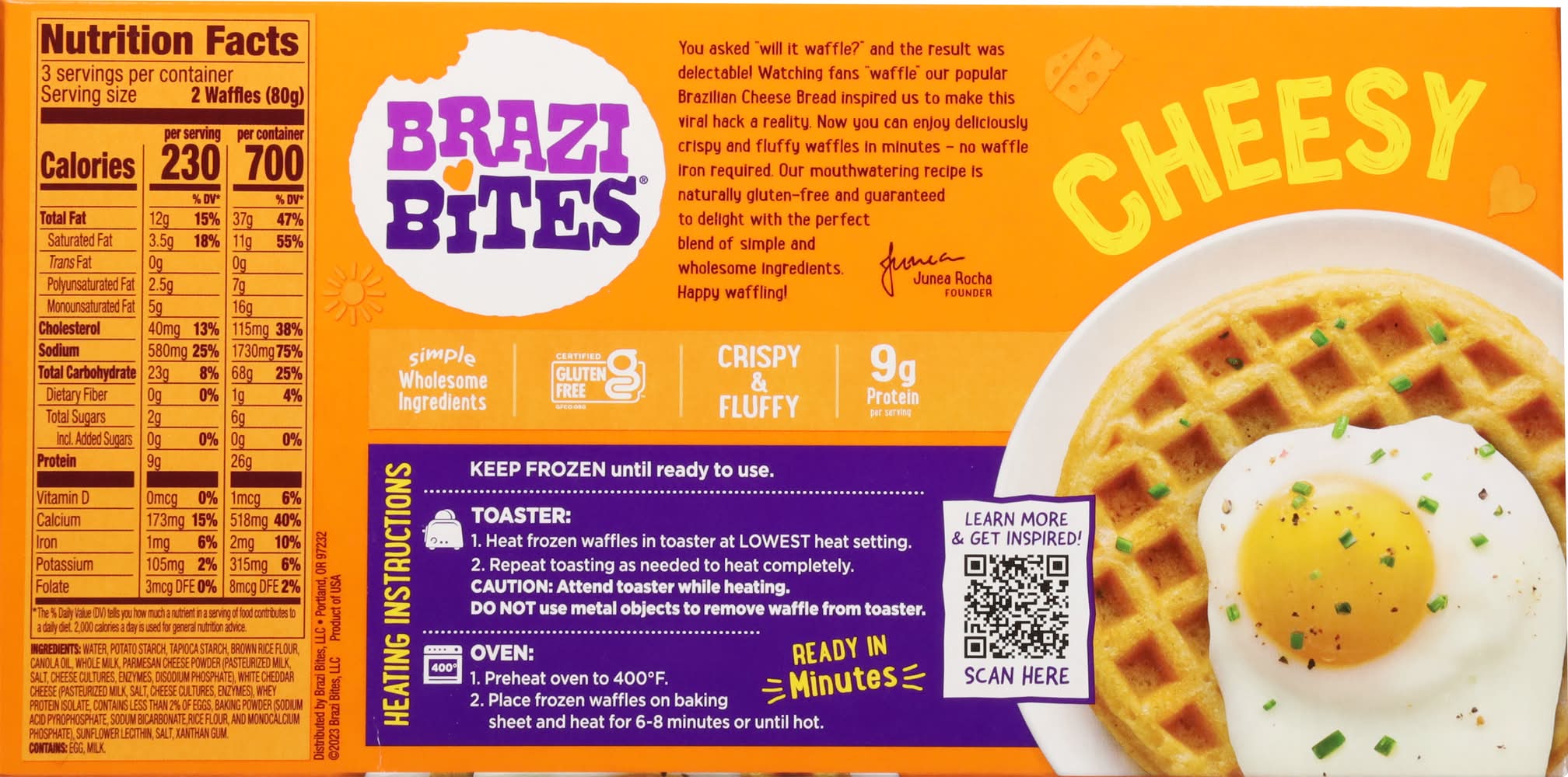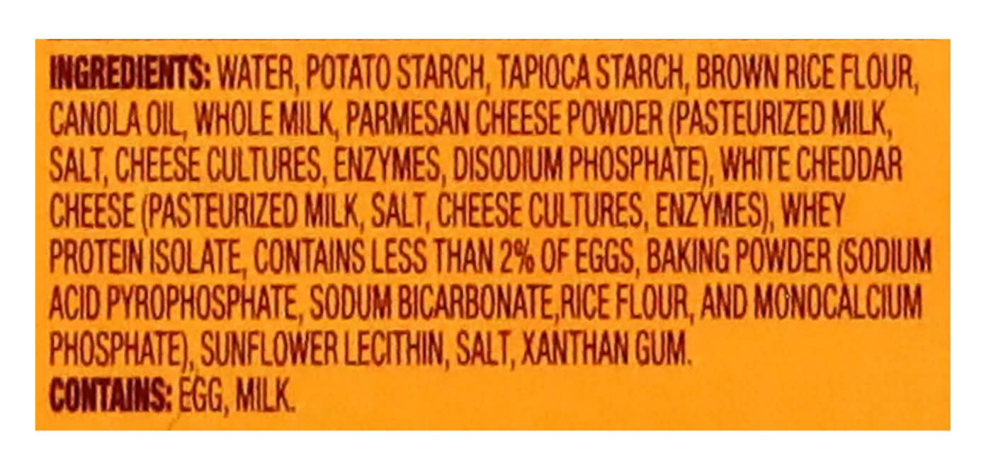 Water, Potato Starch, Tapioca Starch, Brown Rice Flour, Canola Oil, Whole Milk, Parmesan Cheese Powder (Pasteurized Milk, Salt, Cheese Cultures, Enzymes, Disodium Phosphate), White Cheddar Cheese (Pasteurized Milk, Salt, Cheese Cultures, Enzymes), Whey Protein Isolate, Contains Less than 2% of Eggs, Baking Powder (Sodium Acid Pyrophosphate, Sodium Bicarbonate, Rice Flour, and Monocalcium Phosphate), Sunflower Lecithin, Salt, Xanthan Gum Contains: Eggs, Milk