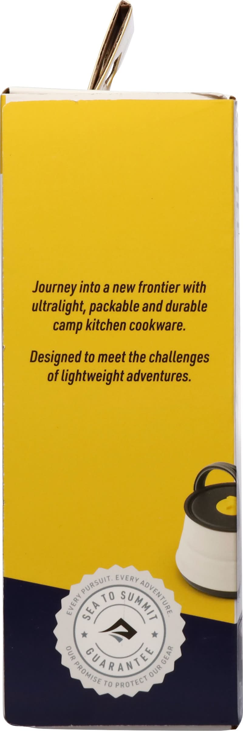 Seatosummit. Food grade heat resistant silicone. Dual handles for stable pouring. Nests with Frontier products. Hard anodised aluminium . Hard anodised aluminium base for superior heat conduction. Hard anodised aluminium base for superior heat conduction. Two glass-reinforced nylon 66 handles improves control when pouring. Nesting design for compact storage. Journey into a new frontier with ultralight, packable and durable camp kitchen cookware. Designed to meet the challenges of lightweight adventures. Every pursuit. Every adventure. Sea to Summit guarantee. Our promise to protect our gear. seatosummit.com. arl.org.au. Full warnings and instructions. Healthy BPA PFOA & PTFE free. BPA-free, food-grade, heat resistant, flexible silicone sides. FSC: Mix - Packaging from responsible sources. Made in China. Product and packaging designed by Sea to Summit, Perth, Australia. Sea to Summit Pty Ltd,