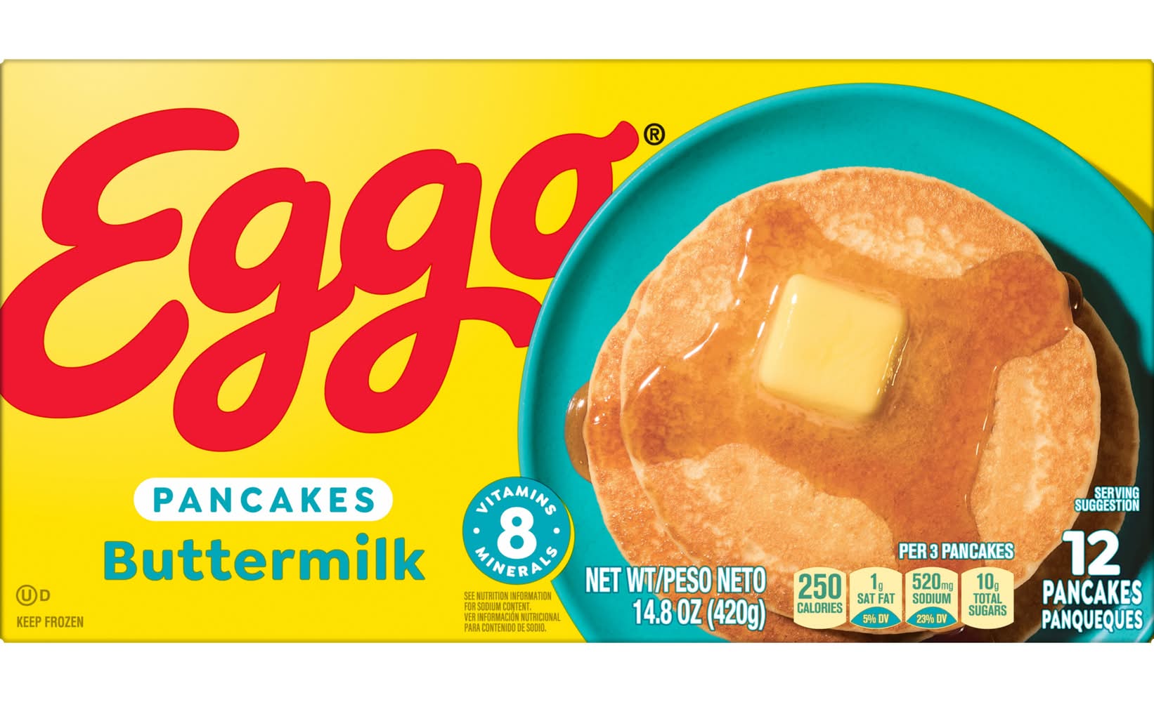 Wake up and greet the day with the feel-good taste of Eggo Buttermilk Pancakes. These delicious pancakes pair beautifully with your favorite breakfast sides year-round. Pop these frozen pancakes in the microwave or oven for a soft, fluffy texture and the familiar, inviting flavor of homemade pancakes. They are made with no artificial colors and flavors, and they provide a good source of eight vitamins and minerals (see nutrition information for sodium content); Conveniently packaged and easy to prepare, Eggo Pancakes help bring warmth and smiles to fast-paced, busy mornings. Great for families and individuals alike, these delicious pancakes are made to enjoy as a stand-alone breakfast treat or with your favorite morning toppings such as butter and syrup, jellies and preserves, and whipped cream. • Flavor: Buttermilk • Kellogg Sales Co., Battle Creek, MI, 49016 • Packaging: Reusable