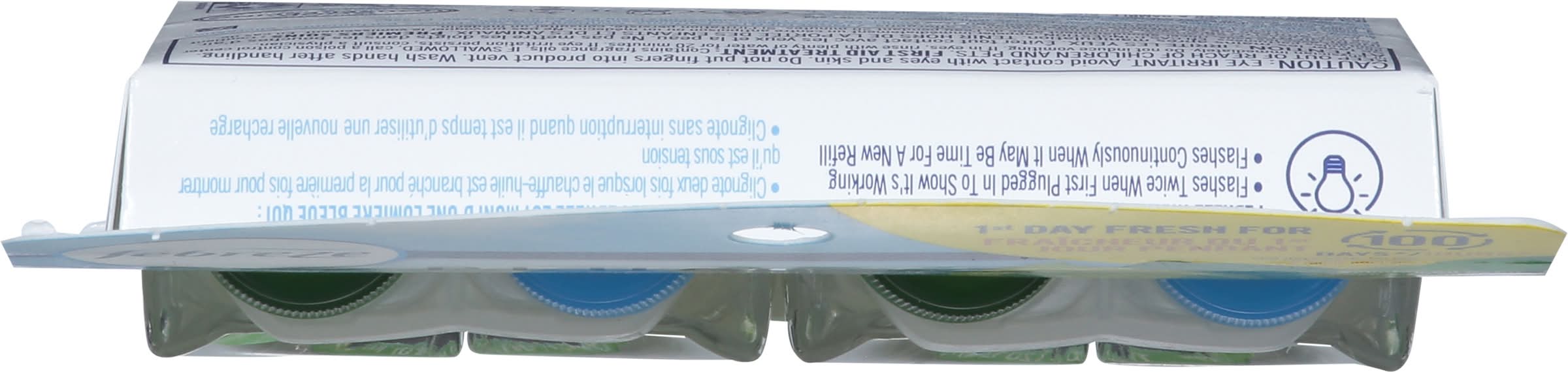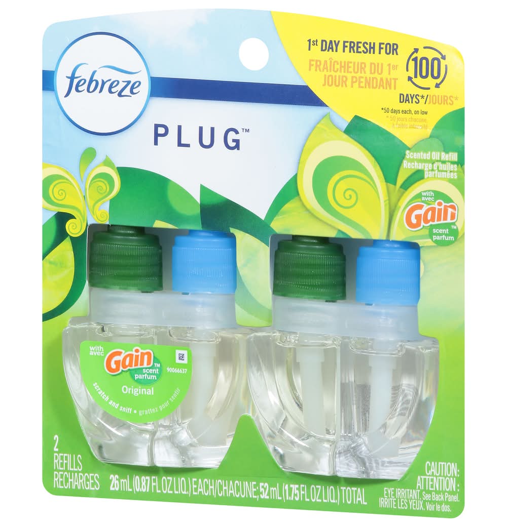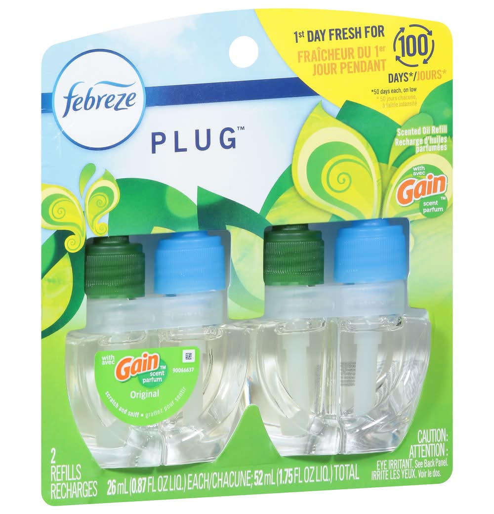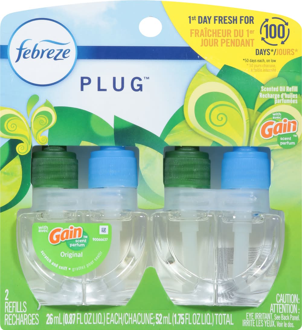 1st day fresh for 100 days (50 days each, on low). Scented oil refill with Gain scent. Scratch and sniff. Formulated with: No dyes. No phthalates. No formaldehyde. Low level indicator. Blue light flashes when it might be time to refill. Febreze warmer has a blue light that: Flashes twice when first plugged in to show it's working. Flashes continuously when it may be time for a new refill. Good Housekeeping: • Pack size: 2 • Procter & Gamble, Cincinnati,OH,45202, • Packaging: Reusable