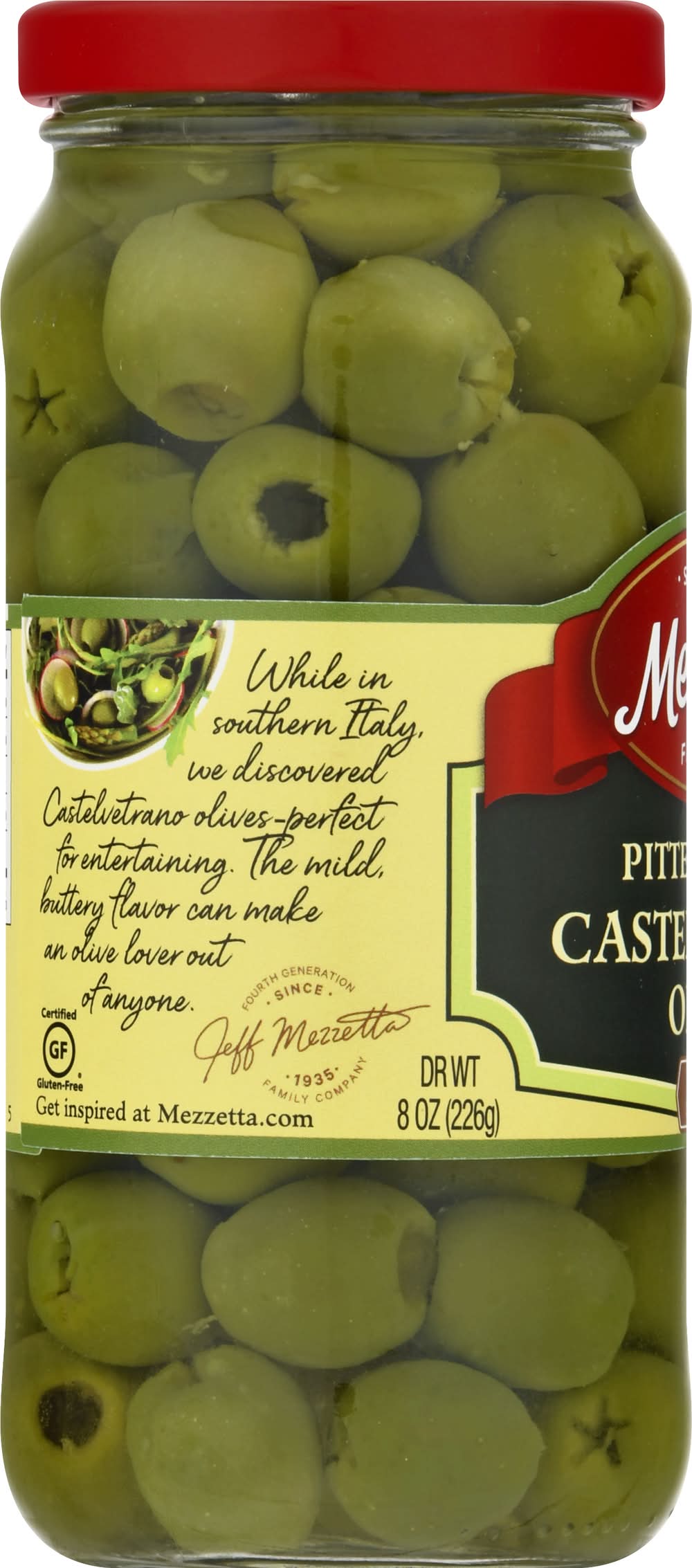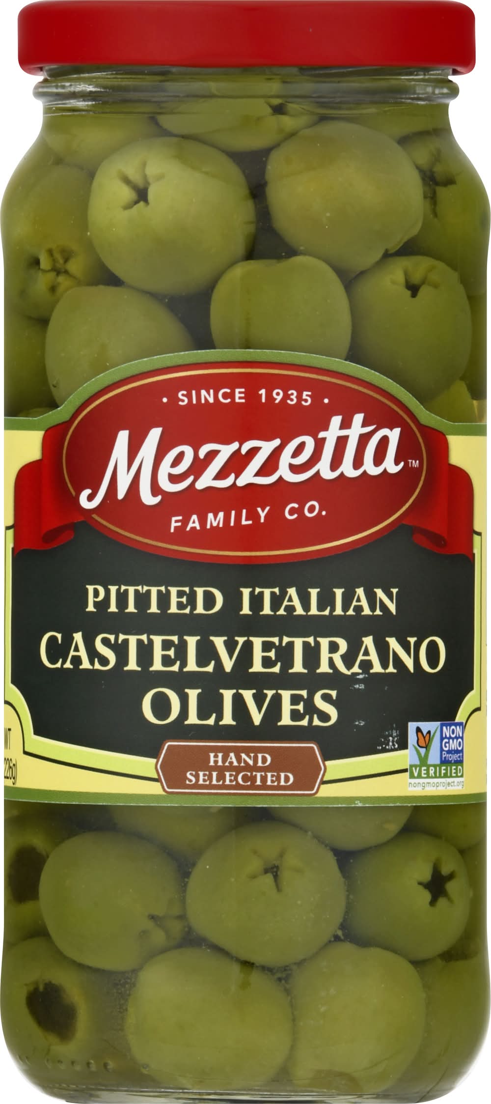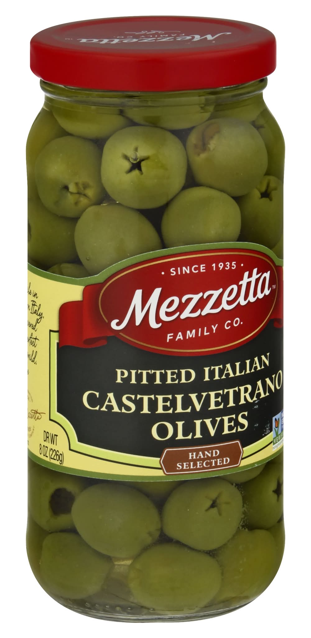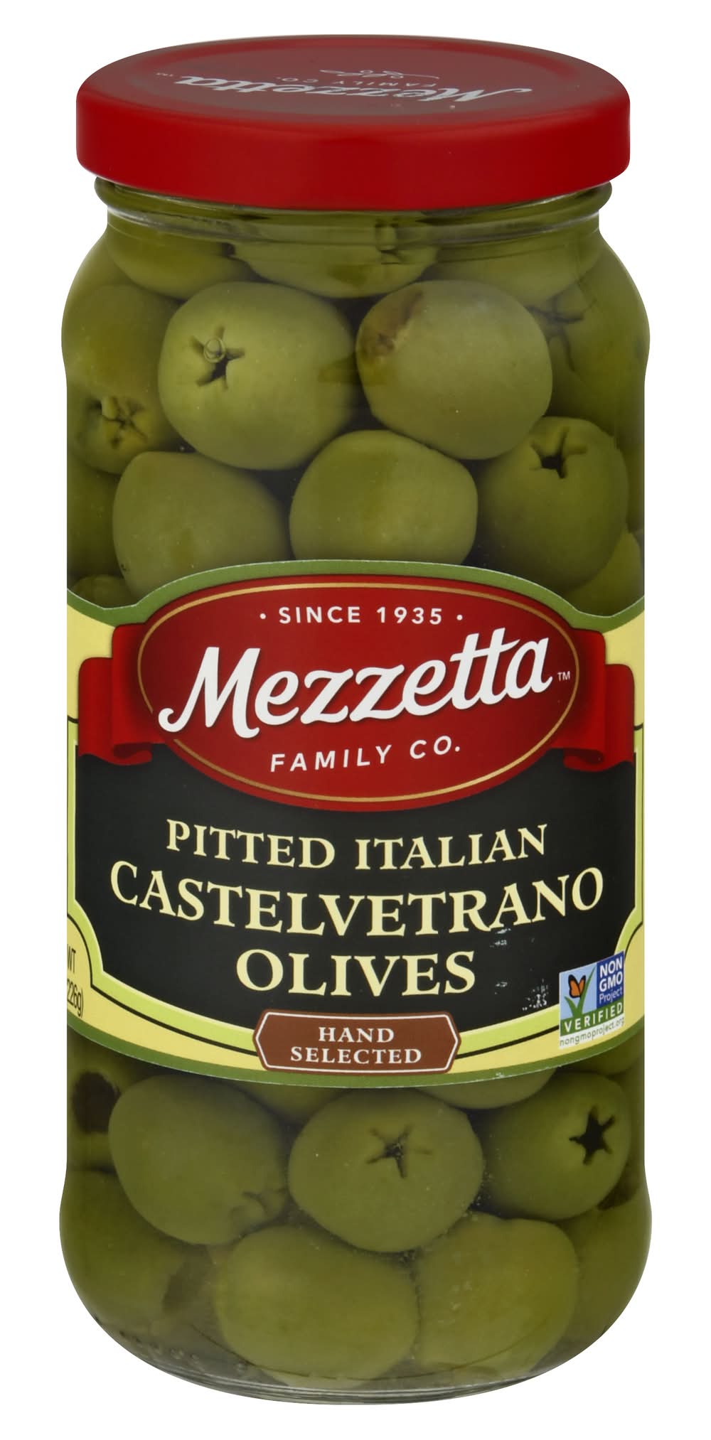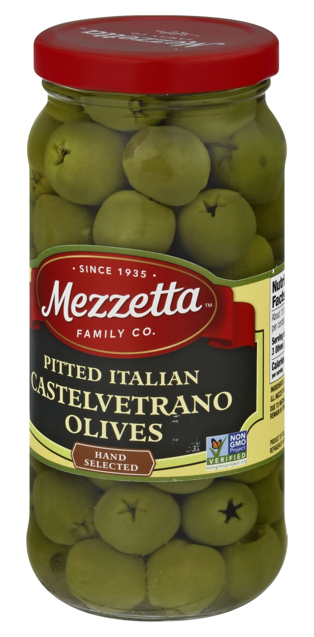 Hand selected. Certified Gluten-free. Non-GMO Project verified. nongmoproject.org. Since 1935. While in southern Italy, we discovered Castelvetrano olives - perfect for entertaining. The mild, buttery flavor can make an olive lover out of anyone. • Gl Mezzetta Inc, American Canyon , Napa Valley , CA , 94503 • Packaging: Reusable