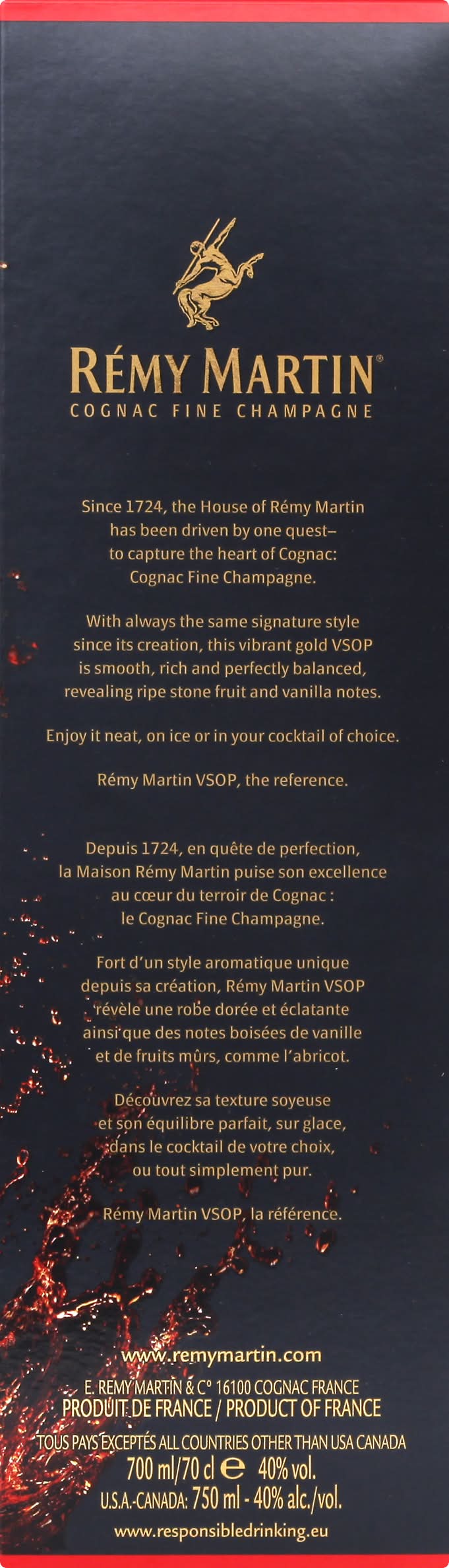 Fine champagne. Since 1724, the House of Remy Martin has been driven by one quest - to capture the heart of Cognac: Cognac Fine Champagne. With always the same signature style since its creation, this vibrant gold VSOP is smooth, rich and perfectly balanced, revealing ripe stone fruit and vanilla notes. Enjoy it neat, on ice or in your cocktail of choice. Remy Martin VSOP, the reference. 40% alc/vol. 80 Product of France. • Alcohol by volume: 40% • E Remy Martin,