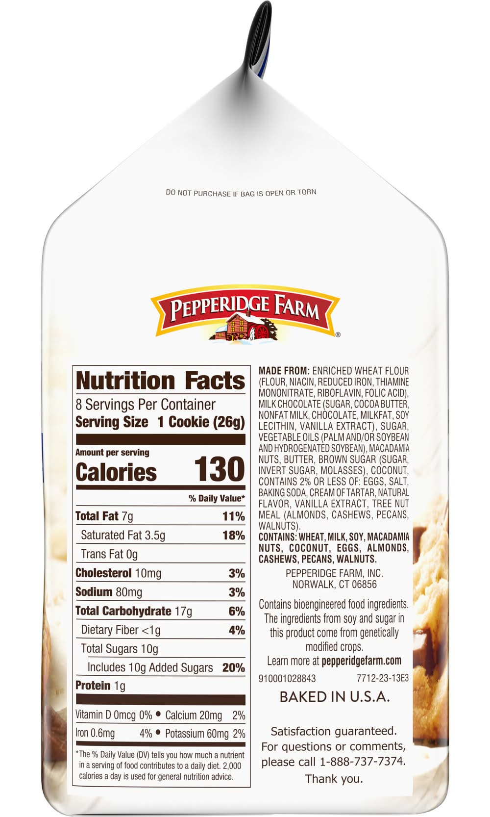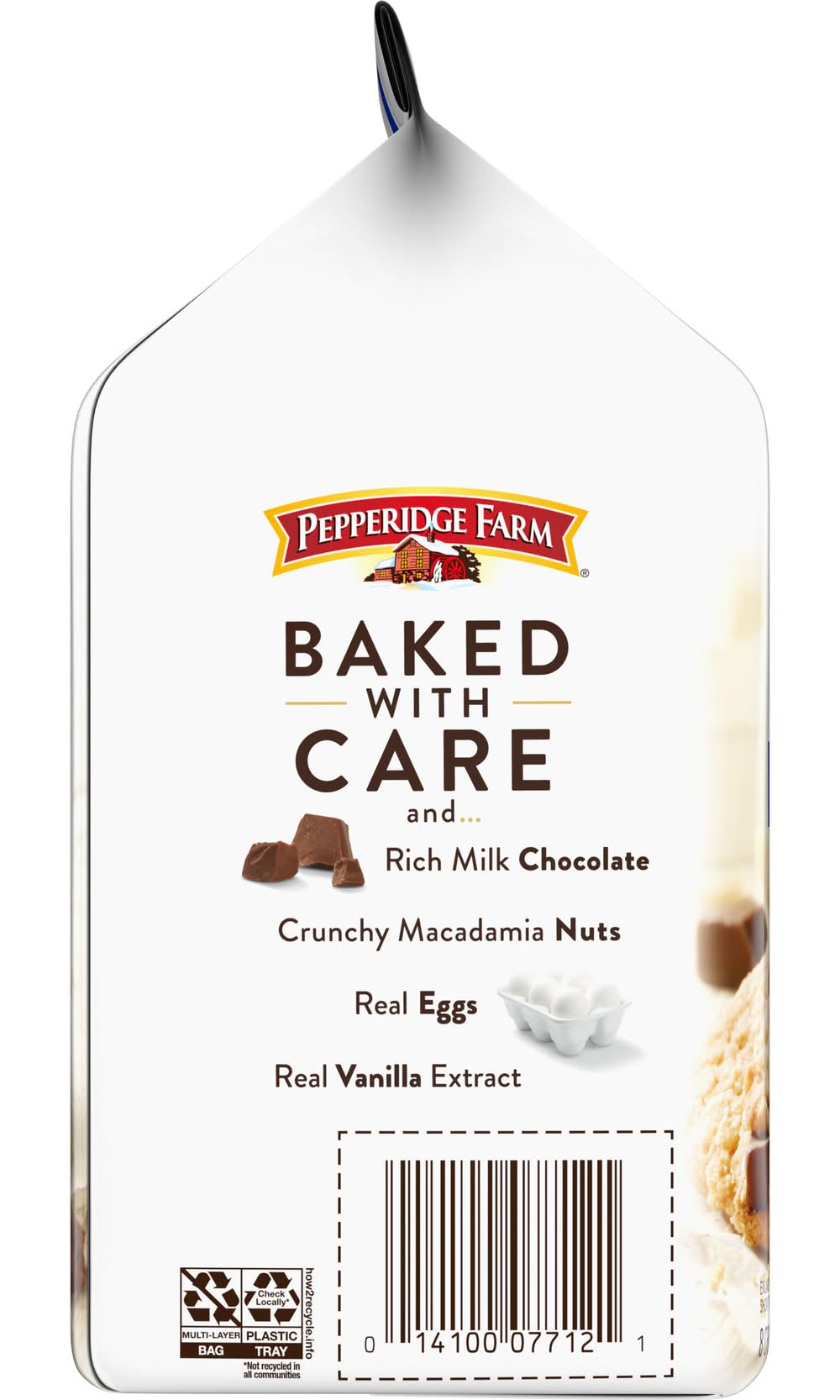 Made with an abundance of rich milk chocolate chunks and crunchy macadamia nuts, these sweet and crispy cookies have a delicious melt-in-your mouth flavor. Every batch is baked with care and quality ingredients, including real eggs and real vanilla extract. perfect for sharing or stashing in your pantry to satisfy your cravings for sweet snacks. Enjoy Cookies on their own, dunk them in a cold glass of milk, or pair them with a hot cup of coffee. Looking for a quick and easy dessert idea for your next party? Our chocolate chunk cookies are great for serving on cookie platters and can be used to make other sweet treats such as ice cream sandwiches and sundaes, our line of chocolate chunk cookies also includes Tahoe White Chocolate Nut Cookies, Chesapeake Dark Chocolate Pecan Cookies, and more. • Flavor: Milk chocolate macadamia • Pepperidge Farm, Inc., Norwalk, CT, 06856 • Packaging: Reusable