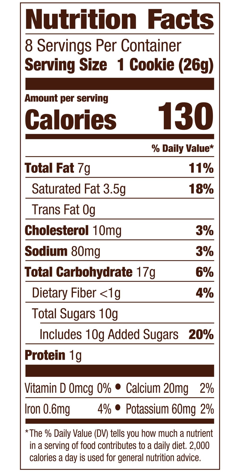 Ingredients: MADE FROM: ENRICHED WHEAT FLOUR (FLOUR, NIACIN, REDUCED IRON, THIAMINE MONONITRATE, RIBOFLAVIN, FOLIC ACID), MILK CHOCOLATE (SUGAR, COCOA BUTTER, NONFAT MILK, CHOCOLATE, MILKFAT, SOY LECITHIN, VANILLA EXTRACT), SUGAR, VEGETABLE OILS (PALM AND/OR SOYBEAN AND HYDROGENATED SOYBEAN), MACADAMIA NUTS, BUTTER, BROWN SUGAR (SUGAR, INVERT SUGAR, MOLASSES), COCONUT, CONTAINS 2% OR LESS OF: EGGS, SALT, BAKING SODA, CREAM OF TARTAR, NATURAL FLAVOR, VANILLA EXTRACT, TREE NUT MEAL (ALMONDS, CASHEWS, PECANS, WALNUTS), . CONTAINS: WHEAT, MILK, SOY, MACADAMIA NUTS, COCONUT, EGGS, ALMONDS, CASHEWS, PECANS, WALNUTS. Contains: CONTAINS: Egg, Gluten, Milk/Dairy, Nut, Soybean, Wheat