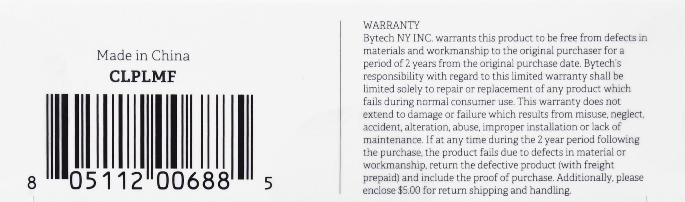 Life, simplified. 2.4 amp with lightning tip. Compatible with most apple devices. 2.4 amp/12 watts. Powered for tablet or smartphone. IC chip protects from over-charging. Quick charge technology. Powered indicator LED light. For iPad, iPhone and iPod. IC chip protects from over-charging. Power light indicator. Input: 12 v - 24 v. Output: 5v - 2.4 amp. iPod touch 5th generation. 32 GB 64 GB. iPod Nano 7h generation: 16 GB. iPhone 5/5S/5C: 16 GB; 32 GB; 64 GB. iPhone 6/62 16 GB 64 GB 128 GB. iPhone 6 Plus/6s Plus: 16 GB; 64 GB; 128 GB. iPad 4th generation: 16 GB; 32 GB; 64 GB; 128 GB. Made for iPod, made for iPhone and made for iPad means that an electronic accessory has been designed to connect specifically to iPod, iPhone or iPad, respectively and has been certified by the developer to meet Apple performance standards. Apple is not responsible for the operation of this device or its compliance with safety and regulatory standards. Please note that the use of this accessory with iPod, iPhone or iPad may affect wireless performance. Warranty: Bytech NY Inc. warrants this product to be free from defects in materials and workmanship to the original purchaser for a period of 2 years from the original purchase date. Bytech's responsibility with regard to this limited warranty shall be limited solely to repair or replacement of any product which fails during normal consumer use. This warranty does not extend to damage or failure which results from misuse, neglect, accident, alteration, abuse, improper installation or lack of maintenance. If at any time during the 2 year period following the purchase, the product fails due to defects in materials or workmanship, return the defective product (with freight prepaid) and include the proof of purchase. Additionally, please enclose $5.00 for return shipping and handling. CE listed. www.bytechintl.com. Contact Info: 2585 West 13th Street, Brooklyn, NY 11223. Made in China. Bytech NY,