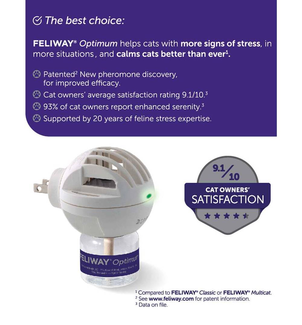 Feliway Optimun helps to solve all the frequent signs of stress to be able to offer the best tranquillity to our cats, thanks to its new feline pheromone complex with improved efficiency The satisfaction level of Cat Lovers is 9.1 out of 10, this is because 93% of cat lovers have observed a greater calmness and serenity in their cat since using Feliway Optimun, as it helps cats in more situations and visibly reduces more signs of stress by avoiding situations such as vertical scratches, changes, fears, urine marking, tensions and conflicts with other cats How does the New Generation of Pheromones work? Pheromones are natural messages that animals use to communicate with their environment and everything around them, reducing all the frequent signs of stress in cats and improving the relationship between them and their owners Cats naturally produce reassuring messages known as pheromones. FELIWAY Optimum contains the most advanced Feline Pheromone Complex, developed by the FELIWAY research team. This new discovery transmits messages of tranquillity that help cats feel comfortable and safe at home, provide serenity and promote harmony between cats and their owners. FELIWAY Optimum contains the best of the feline pheromones for improved efficiency. It is suitable for all stages of life, from kittens to youngsters to seniors. It is not a sedative or a tranquilizer, used only in cats, it does not affect dogs or people