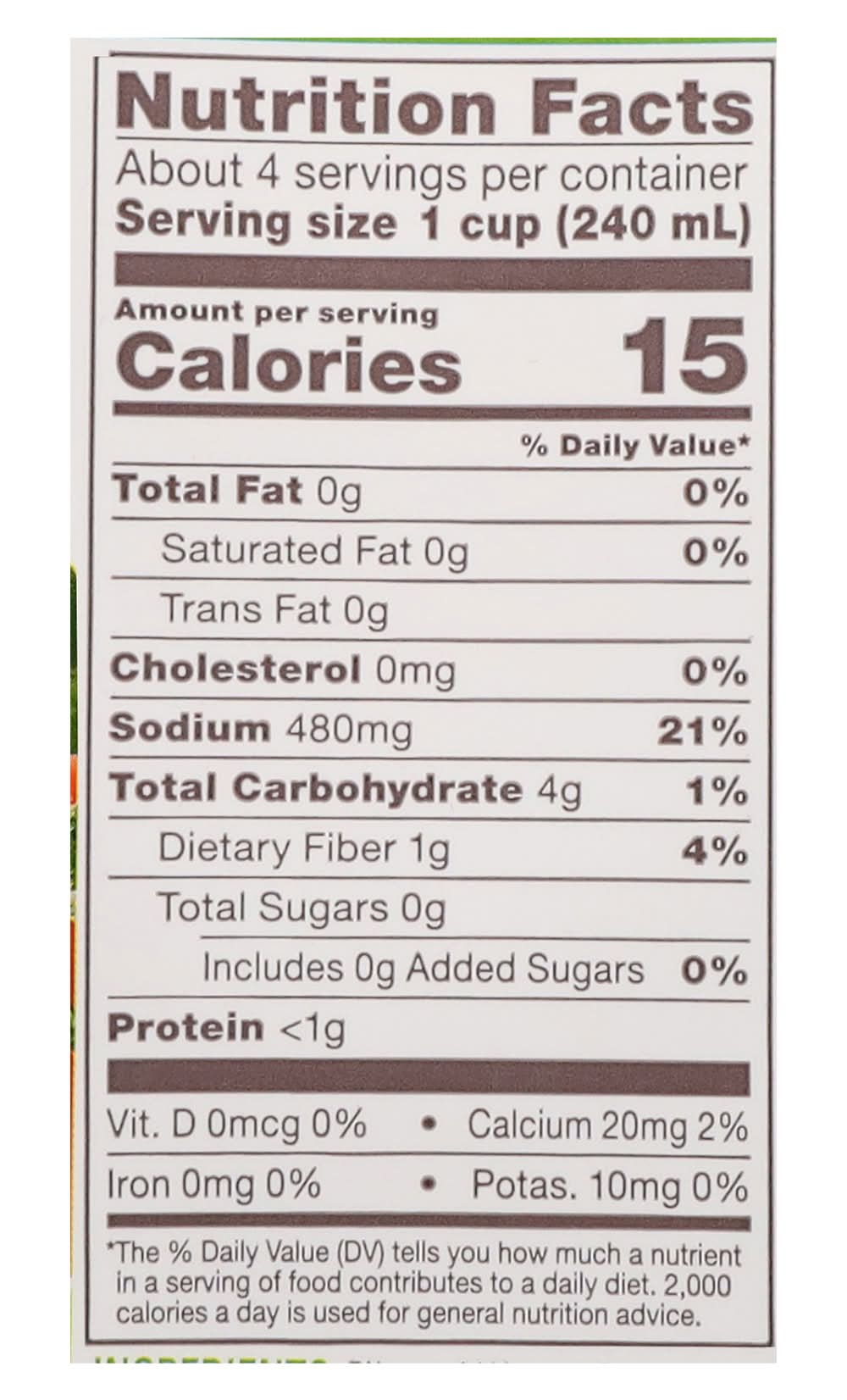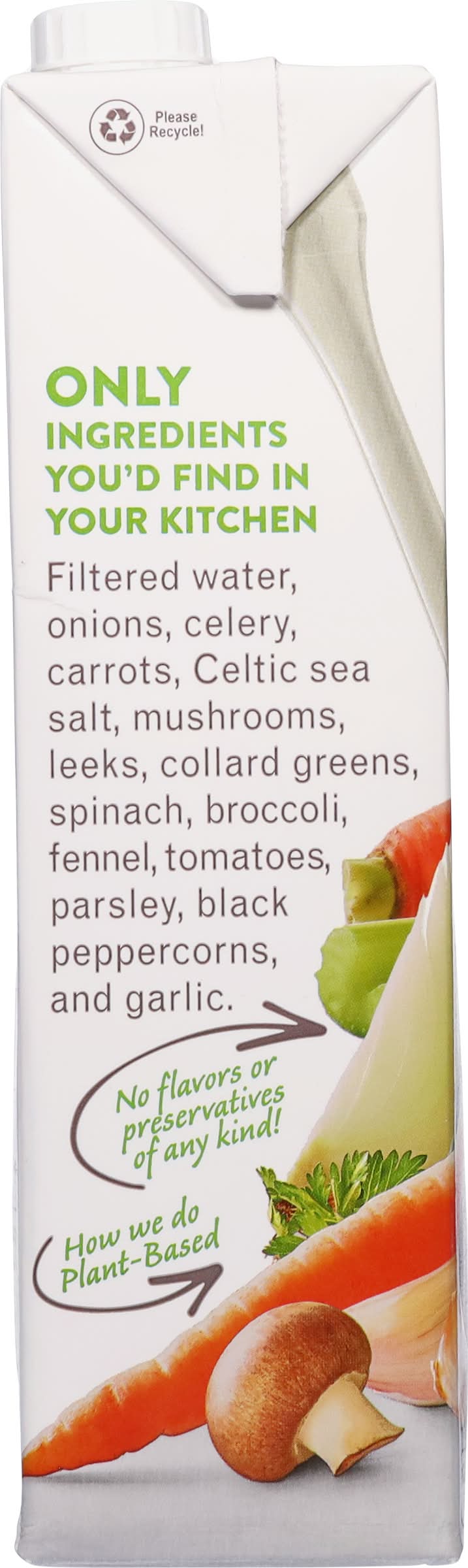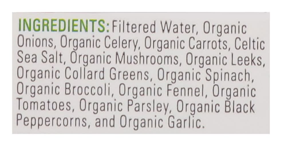 Ingredients: Filtered Water, Organic Onions, Organic Celery, Organic Carrots, Celtic Sea Salt, Organic Mushrooms, Organic Leeks, Organic Collard Greens, Organic Spinach, Organic Broccoli, Organic Fennel, Organic Tomatoes, Organic Parsley, Organic Black Peppercorns, and Organic Garlic. Contains: Celery