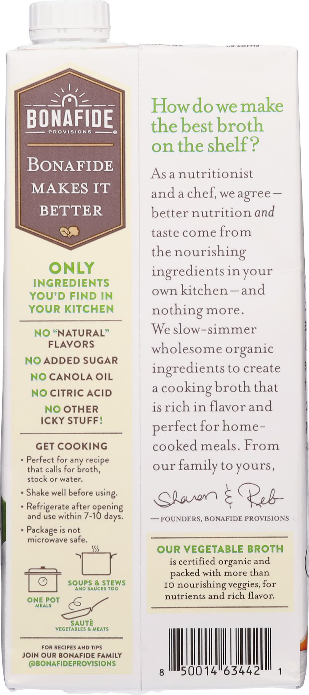 Directions: get cooking: perfect for any recipe that calls for broth, stock or water. shake well before using. refrigerate after opening and use within 7-10 days. package is not microwave safe. one pot meals. soups & stews and sauces too. saute vegetable & meats. twisting cap breaks inner seal.