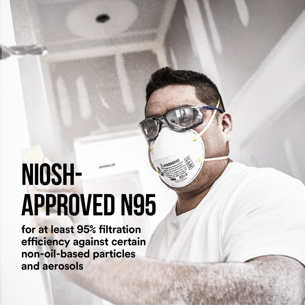 Whether you're sanding drywall, wood or metal surfaces, reach for the 3M Performance Particulate Respirator 8210 for Paint Prep. This N95 respirator features Advanced Electrostatic Media that enhances the capture of airborne particles while allowing for easy breathing. It is designed with stretchable straps, soft nose foam for comfort, and an adjustable nose clip to help ensure a secure custom seal. Projects start with safety-so make sure to pick up the 3M Performance Particulate Respirator 8210 for Paint Prep. WARNING: This respirator helps protect against certain particles. Misuse may result in sickness or death For correct use, consult supervisor and User Instructions or call 3M in U.S.A. at 1-800-247-3941. In Canada, call 1-800-267-4414. Color: White