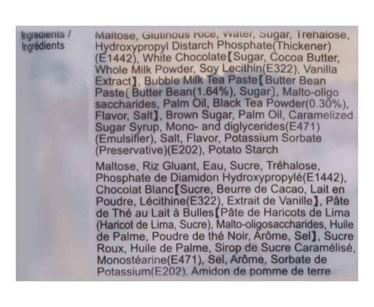 Maltose, Glutinous Rice, Water, Sugar, Trehalose, Hydroxypropyl Distarch Phosphate(Thickener) (E1442), White Chocolate [Sugar, Cocoa Butter, Whole Milk Powder, Soy Lecithin(E322), Vanilla Extract], Bubble Milk Tea Paste [Butter Bean Paste(Butter Bean (1.64%), Sugar), Malto-Oligo Saccharides, Palm Oil, Black Tea Powder (0.30%), Flavor, Salt], Brown Sugar, Palm Oil, Caramelized Sugar Syrup, Mono- and Diglycerides(E471) (Emulsifier), Salt, Flavor, Potassium Sorbate (Preservative)(E202), Potato Starch Contains: Milk, Soybeans, Eggs, Peanuts, Gluten, Sesame, Tree Nuts