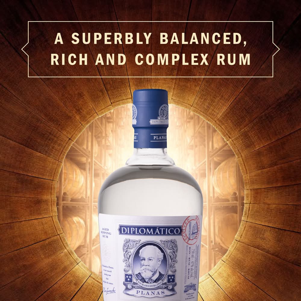 Diplomatico Planas Rum is an elegant aged white rum with a surprisingly fresh, smooth and complex taste that's ideal for elevating classic rum cocktails. Rich and complex, this white rum features fresh and tropical aromas, like ground coffee and coconut. Fruity flavors with a silky texture lead to a delicate and pronounced finish. Carefully crafted, Diplomatico Planas Rum is aged and then charcoal-filtered to get a clear color while retaining depth of flavor. Named after an area nestled at the foot of the Andes Mountains, it draws its smooth and complex flavor from this privileged land. Planas is a favorite among mixologists who want to elevate the complexity, quality, and flavor profile of their cocktails. Enjoy this aged rum neat, on the rocks, or in sophisticated alcohol drinks like a Daiquiri or Mojito. This rum is perfect for sharing on special occasions and makes an impressive gift for family and friends. Please Drink Responsibly. Alcohol by volume: 47%
