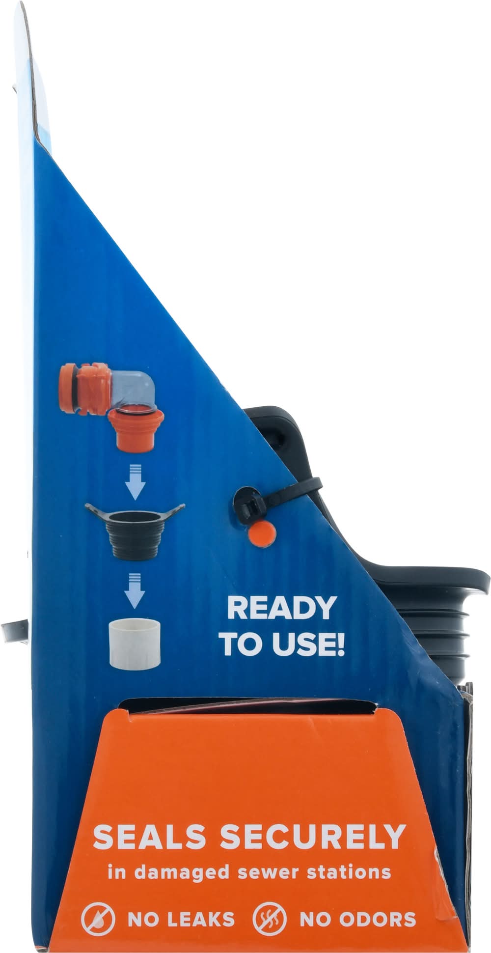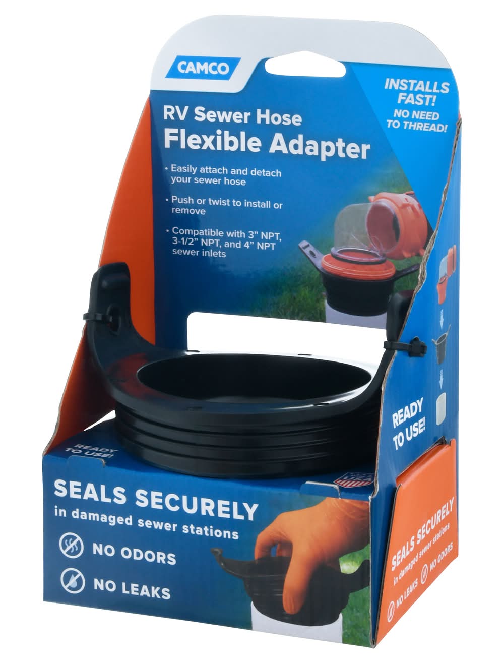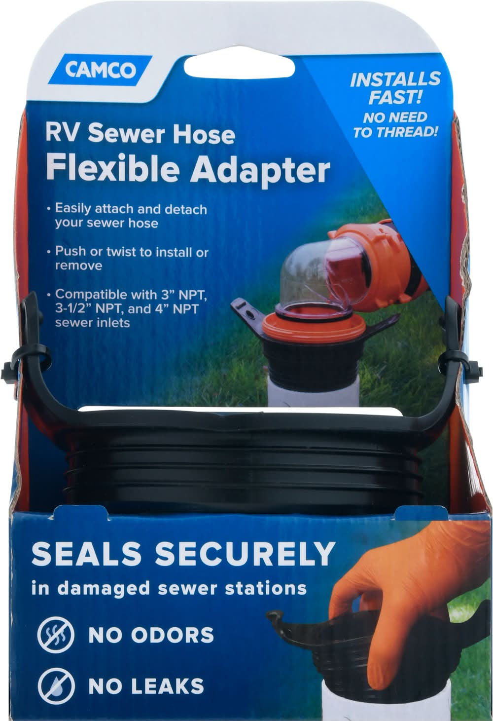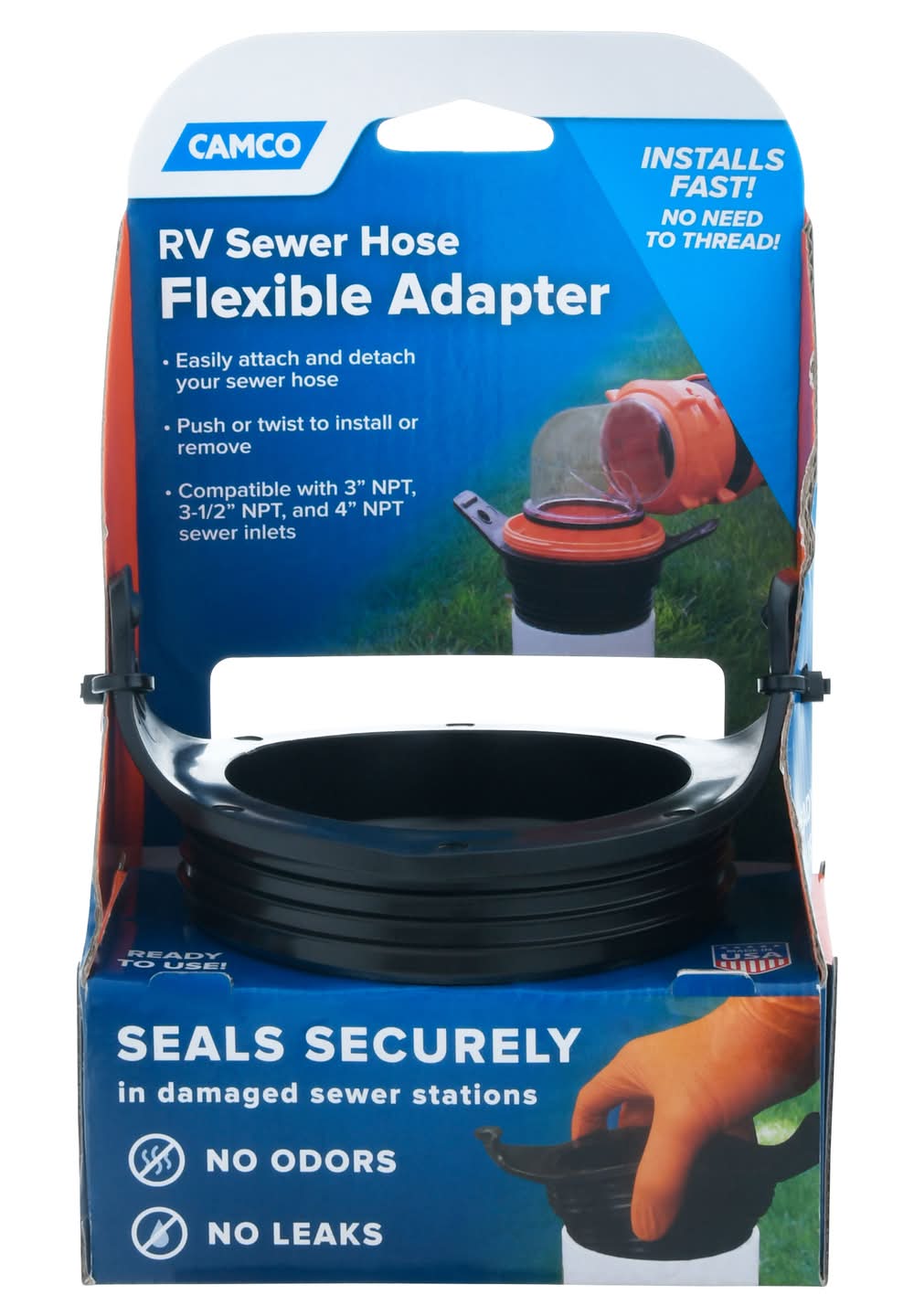 Installs fast! No need to thread! Easily attach and detach your sewer hose. Push or twist to install or remove. Compatible with 3 inches NPT, 3-1/2 inches NPT, and 4 inches NPT sewer inlets. Seals securely in damaged sewer stations. No odors. No leaks. Ready to use! www.camco.net. Made in USA. Camco Manufacturing, Inc.,