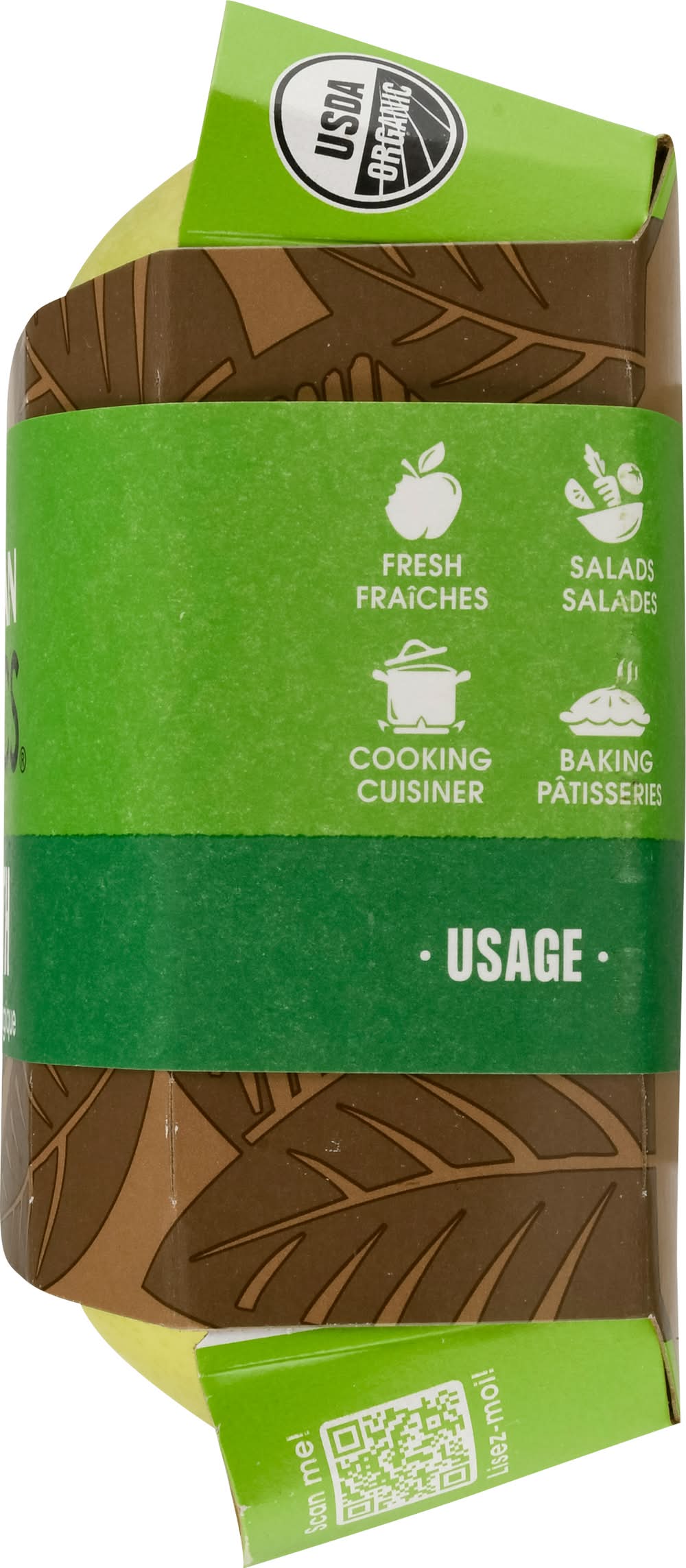 2-1/2 min. Dia. USDA Organic. Crisp with lemon - like tartness. Flavor. Naturally formed for ultimate flavor. Fresh. Salads. Cooking. Baking. Stemilt.om. Scan me! Meets or exceeds U.S. extra fancy. Product of U.S.A.