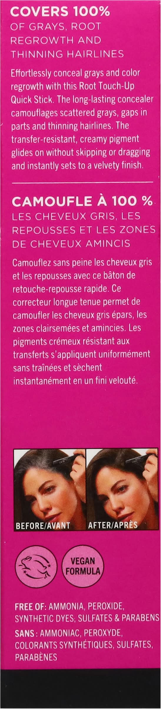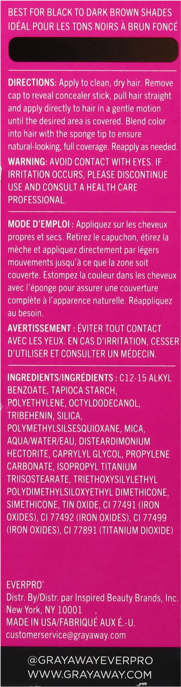 Directions: for best results, apply to clean, dry hair. remove cap to reveal powder stick. apply product to targeted areas in need of gray coverage. use sponge applicator to blend the color. re-apply if necessary or until desired coverage is achieved. thoroughly wash product out before coloring the hair. avoid contact with eyes. if irritation occurs, please discontinue use and consult a health care professional.