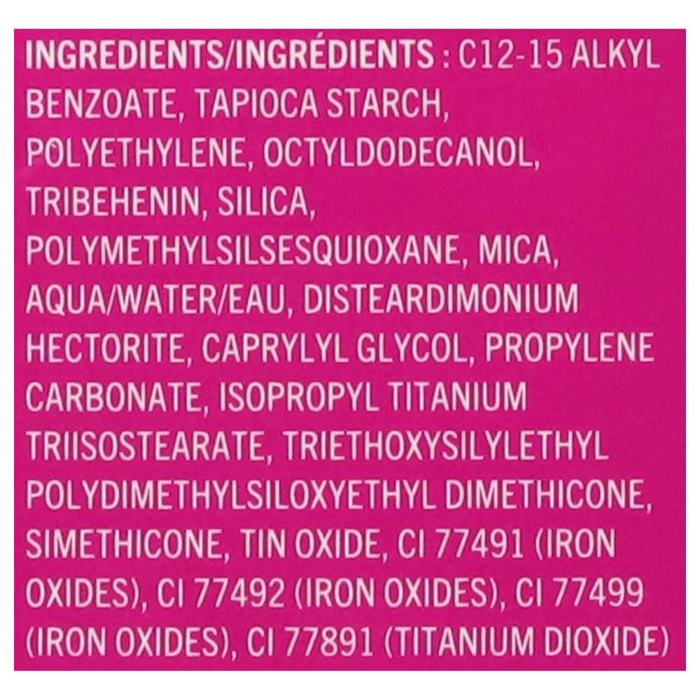 Ingredients: C12-15 Alkyl Benzoate, Tapioca Starch, Polyethylene, Octyldodecanol, Tribehenin, Silica, Polymethylsilsesquioxane, Mica, Aqua/Water/Eau, Disteardimonium Hectorite, Caprylyl Glycol, Propylene Carbonate, Isopropyl Titanium Triisostearate, Triethoxysilylethyl Polydimethylsiloxyethyl Dimethicone, Simethicone, Tin Oxide, CI 77491 (Iron Oxides), CI 77492 (Iron Oxides), CI 77499 (Iron Oxides), CI 77891 (Titanium Dioxide)